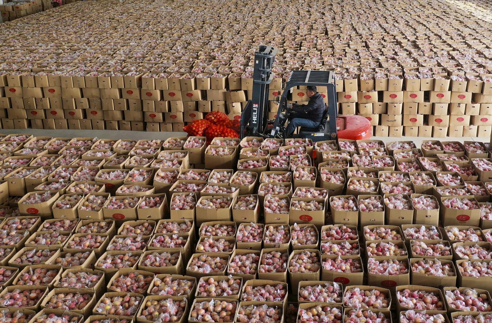 12月2日,运城市万荣县高村镇恒源果业外贸包装车间内,工人正在为全自动化智能选果机转运苹果。 李克荣摄
