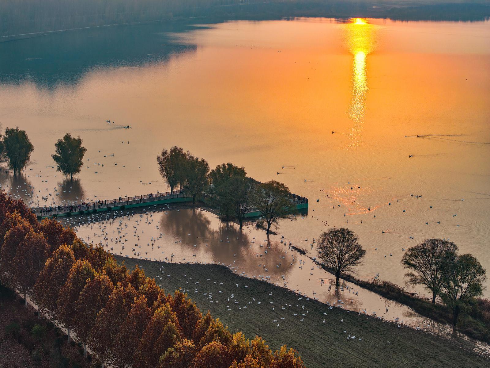 11月16日清晨,运城平陆县黄河湿地三湾段,天鹅群聚湖面。 权永军摄