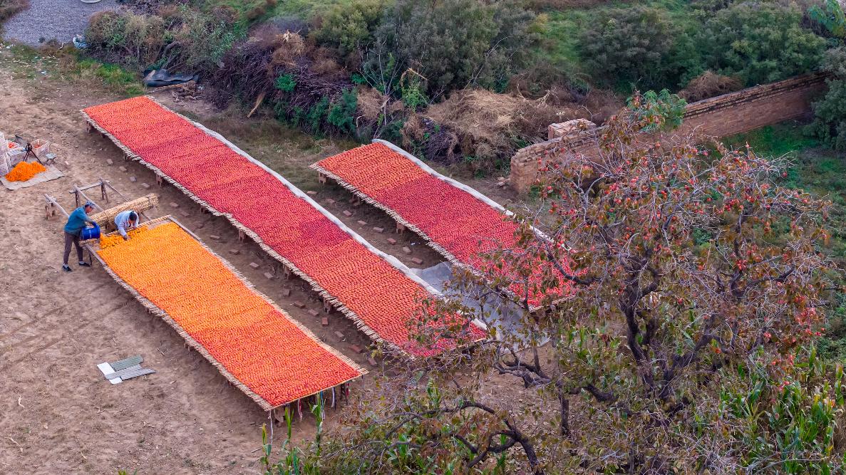 11月2日,运城市万荣县汉薛镇史家埝村村民们在晾晒柿子。 闫鑫摄