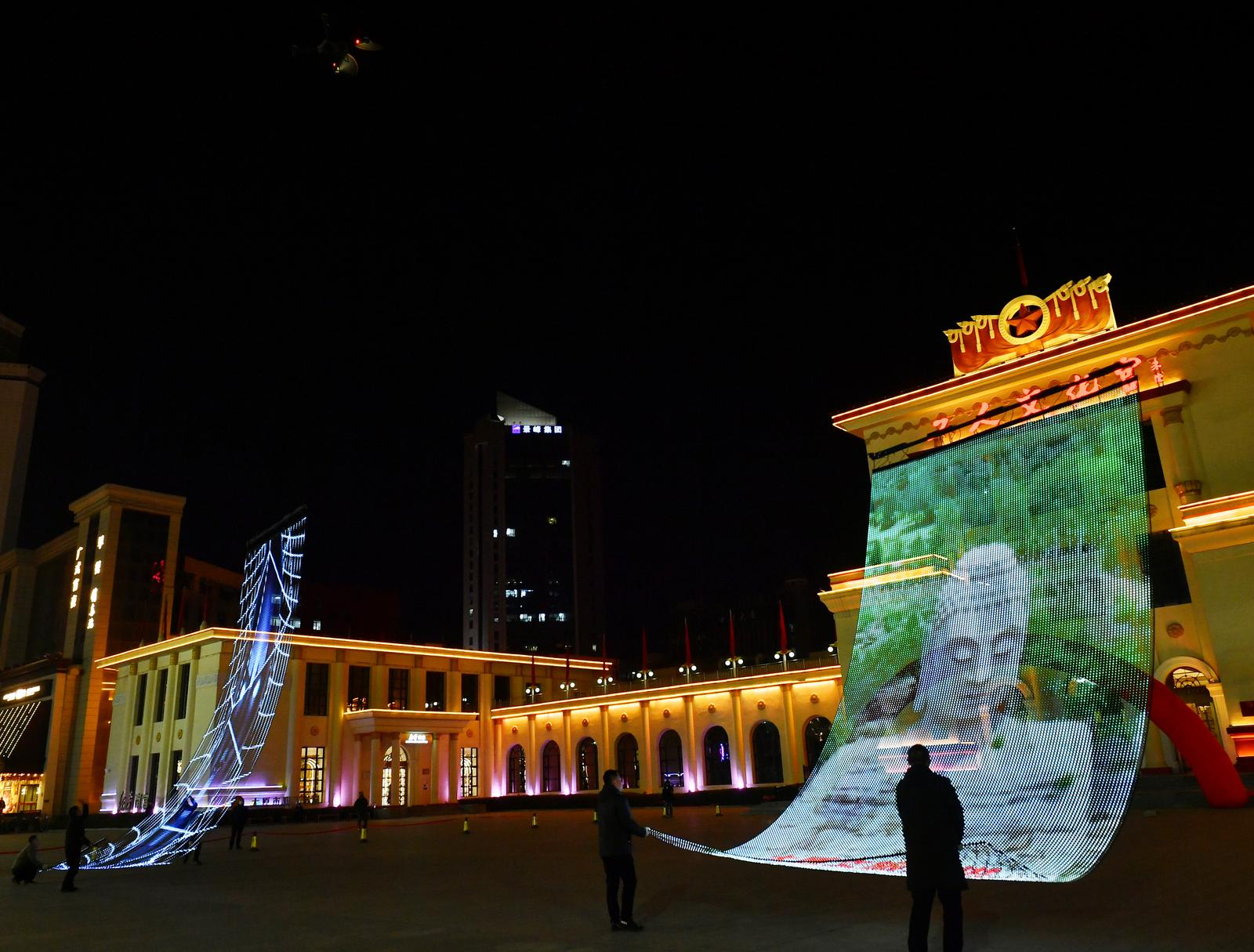 太原市南宫广场,工作人员辅助由无人机助力的飞天屏升空。 高万军摄