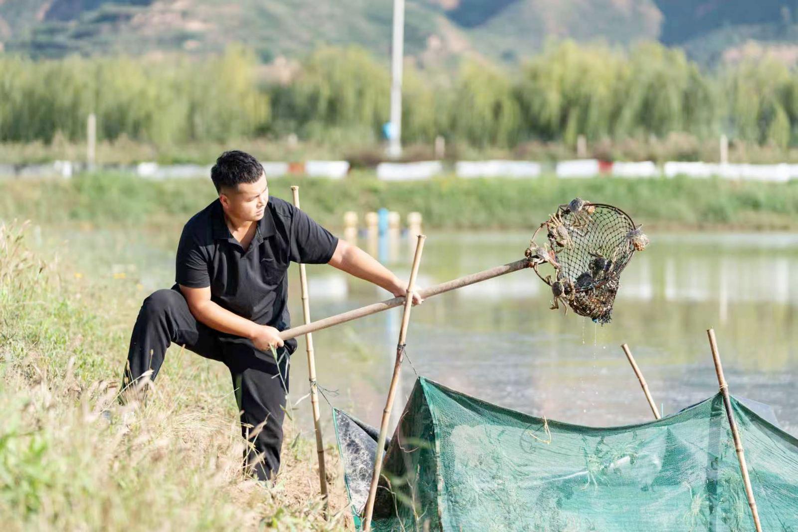 10月16日,在运城市临猗县的连片蟹塘,养殖户拉起沉甸甸的地笼。 兰立强摄