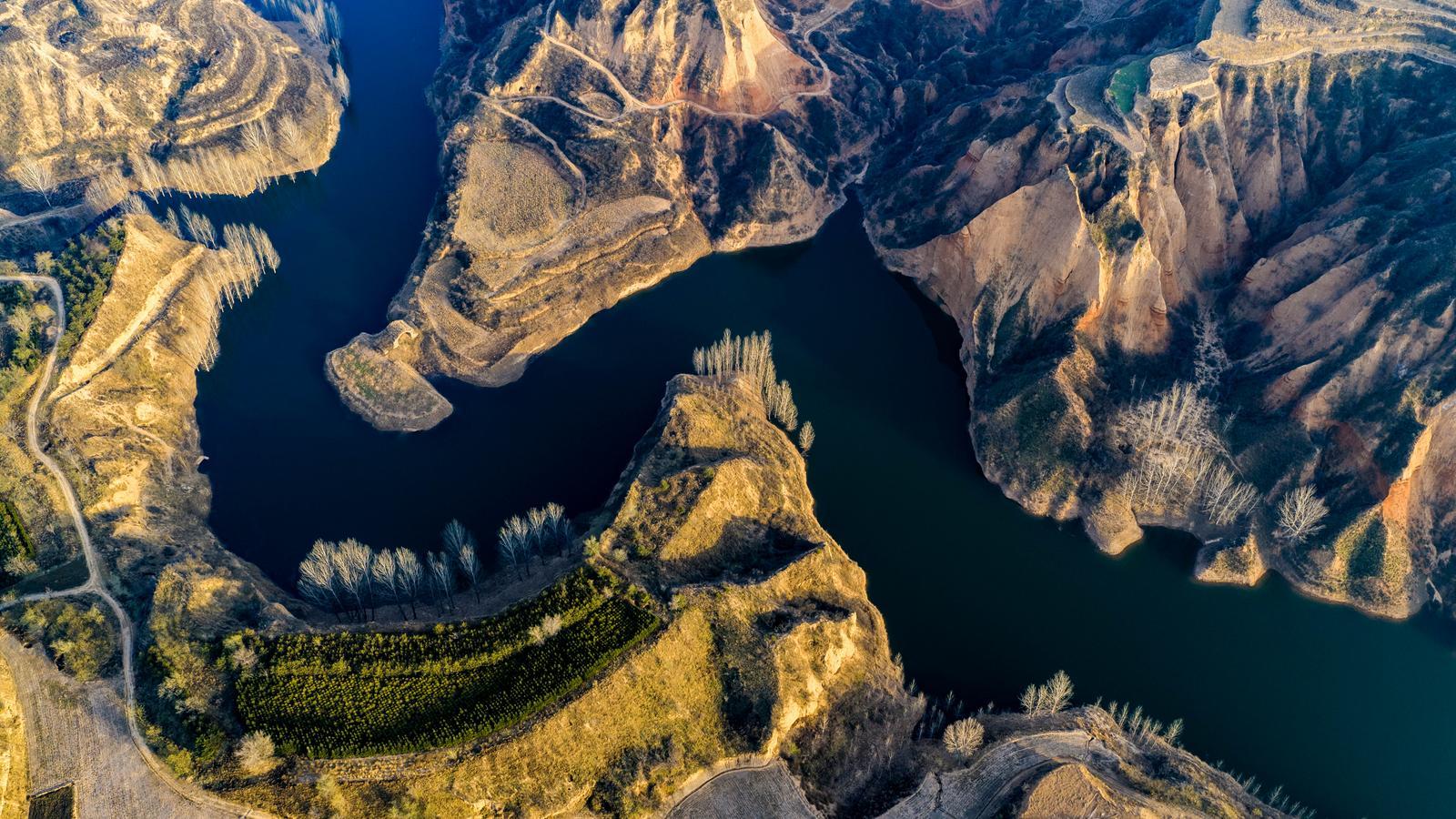 11月30日,从高空俯瞰临汾市洪洞县曲亭水库,蜿蜒曲折。 田红萍摄