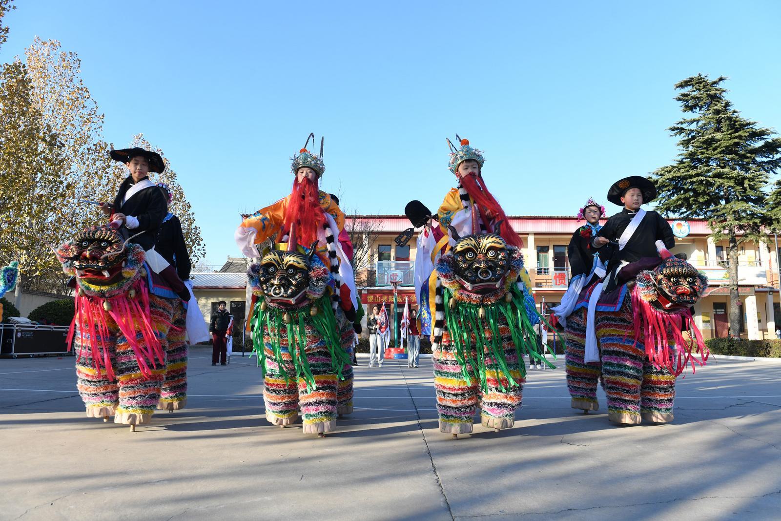 12月3日,运城市稷山县清河镇阳城小学的学生在高跷走兽非遗传承人的指导下,学习表演高跷走兽 栗卢健摄
