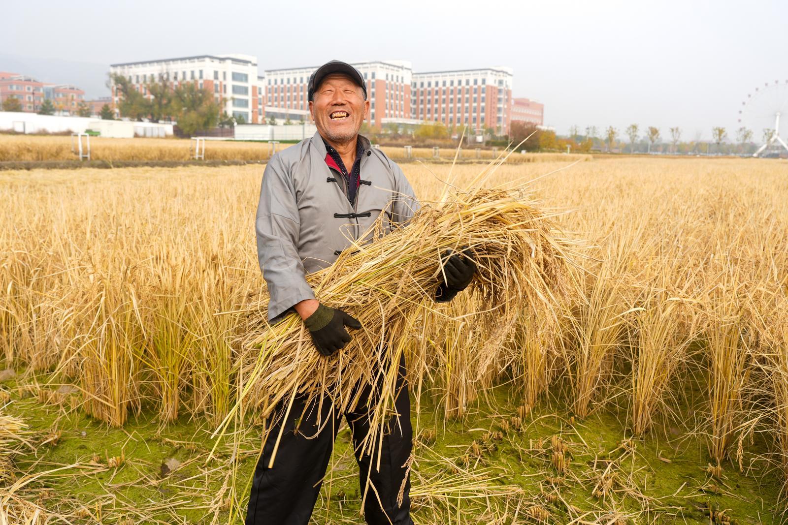10月30日,太原康培稻田公园农户收割水稻,农民脸上洋溢着笑容。 曹翀摄