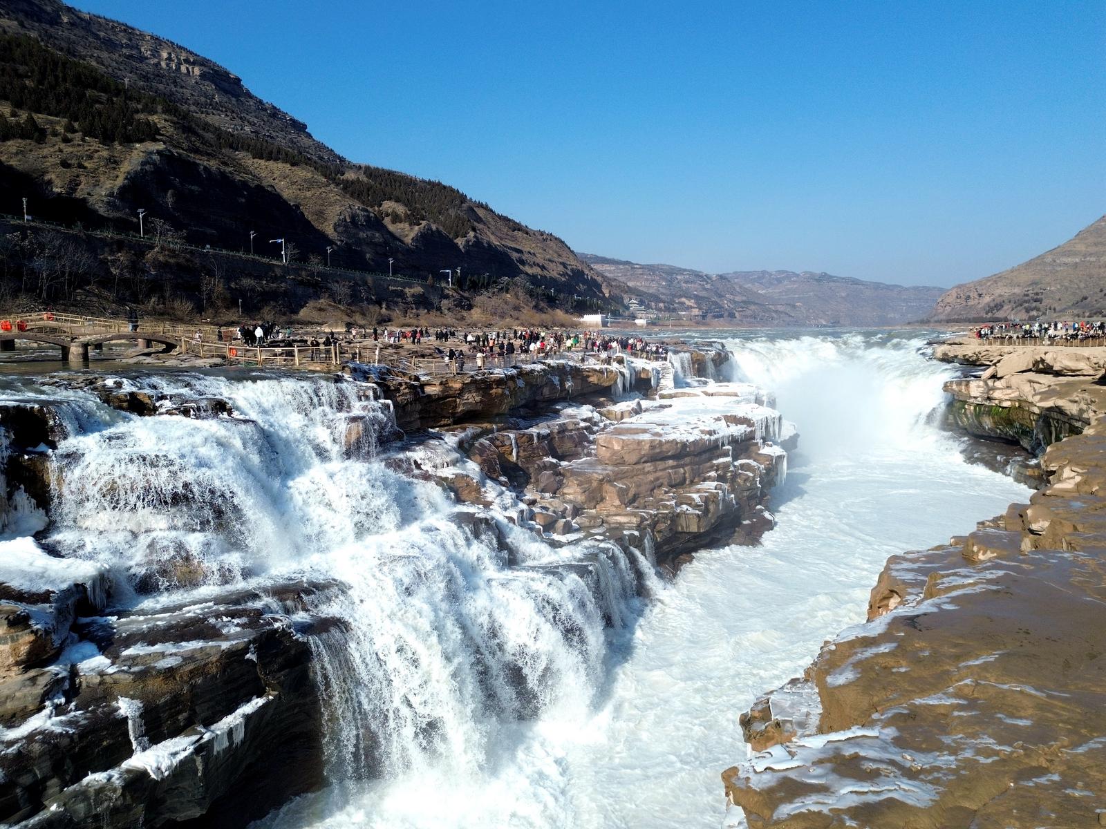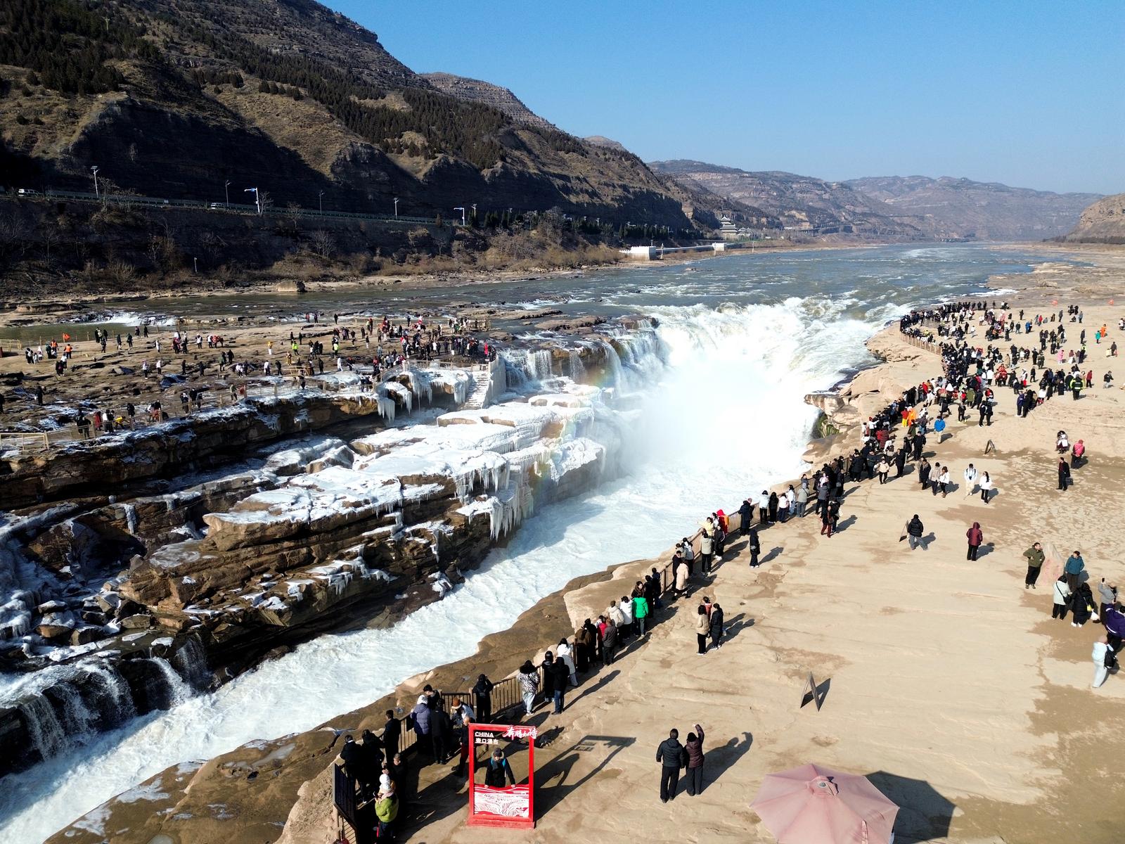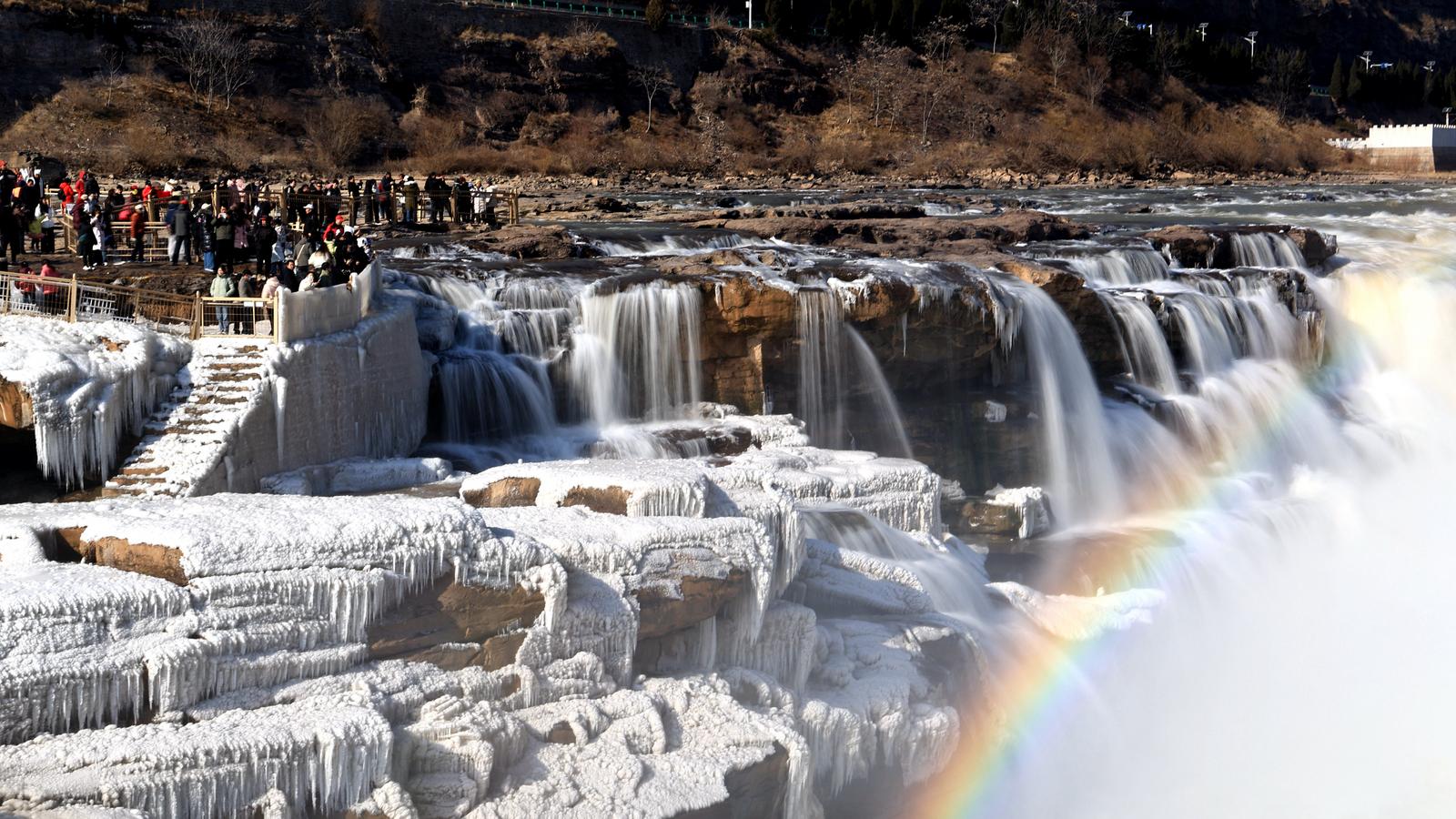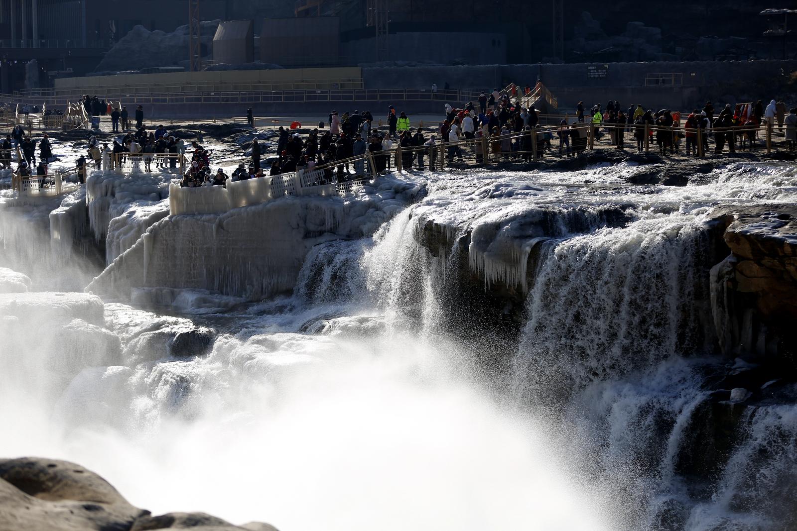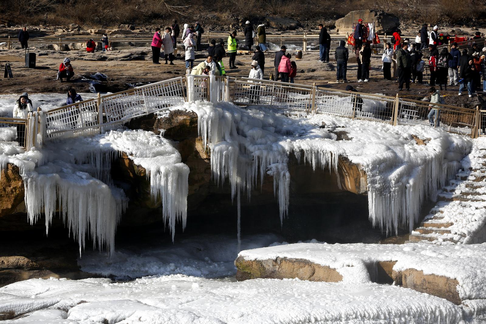 近日,受持续降温天气影响,山西吉县黄河壶口瀑布出现“冰瀑玉壶”景观,吸引不少游客前来观赏。