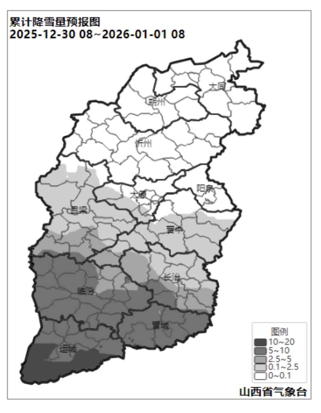 受冷暖空气及补充南下冷空气影响,2025年12月30日至2026年1月5日,山西省将先后出现雨雪、波动性降温天气。12月30日夜间至31日,吕梁-晋中及其以南地区出现雨雪天气,累计降水量1~8毫米,运城、晋城、临汾的局部地区10~12毫米,以雪为主;积雪深度2~8厘米,局部10厘米以上;2026年1月1日—3日以晴间多云天气为主。降水过后中南部局部地区有雾或浓雾。2025年12月31日至2026年1月5日,气温持续较低,南部低温明显,全省最高气温5℃,最低气温北中部-24~-12℃,南部-15~-6℃。全省大部分地区风力以3~4级为主,山区风力可达4~5级、短时6~7级。