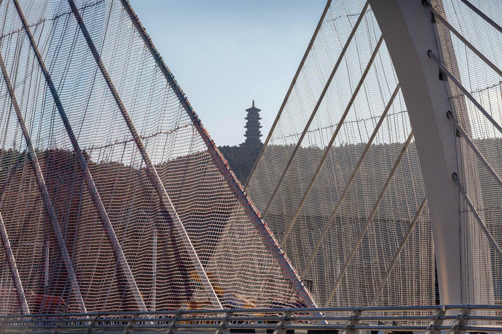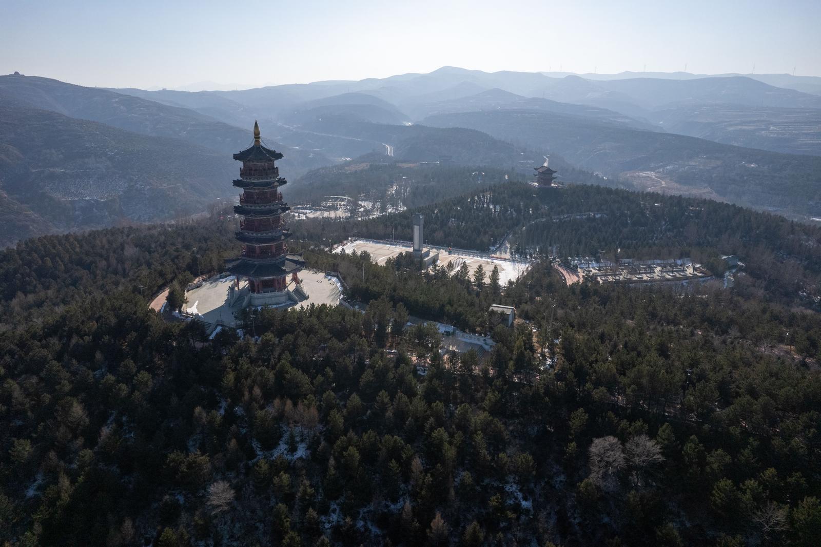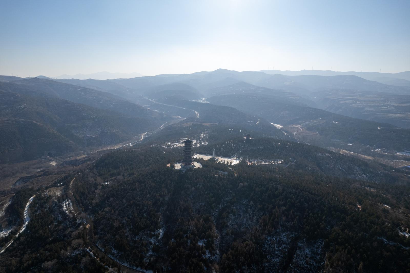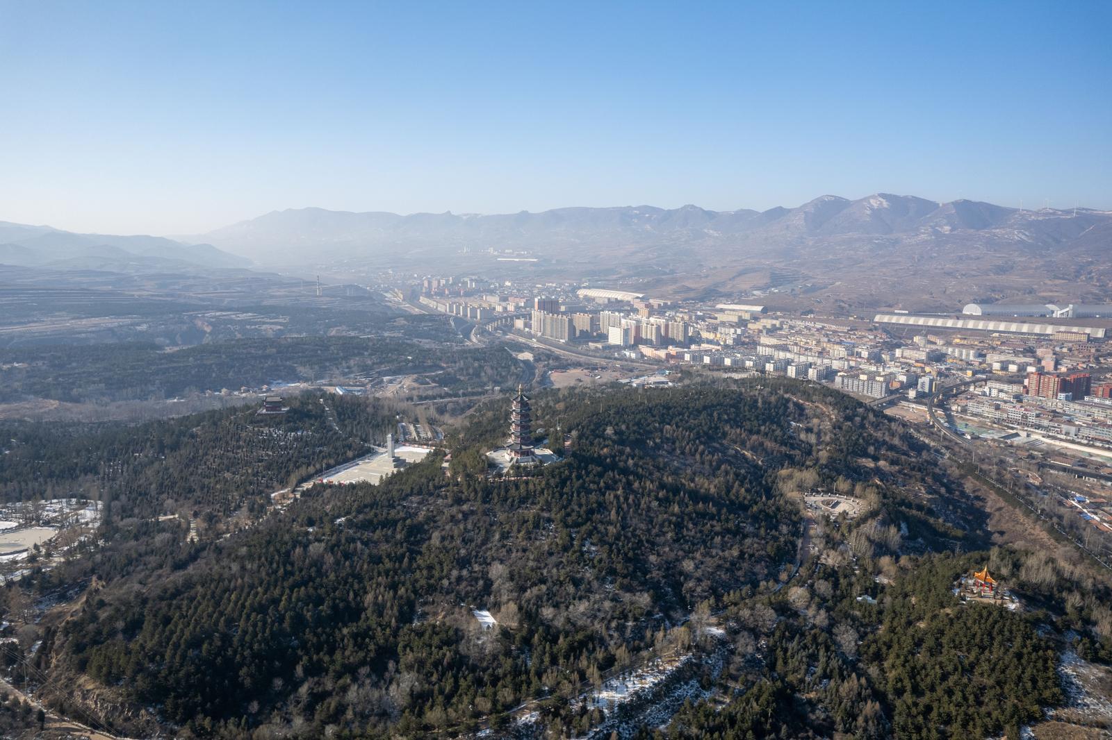 12月28日,山西省忻州市宁武县龙山公园在冬日晴空下尽显古今交融的韵味。
