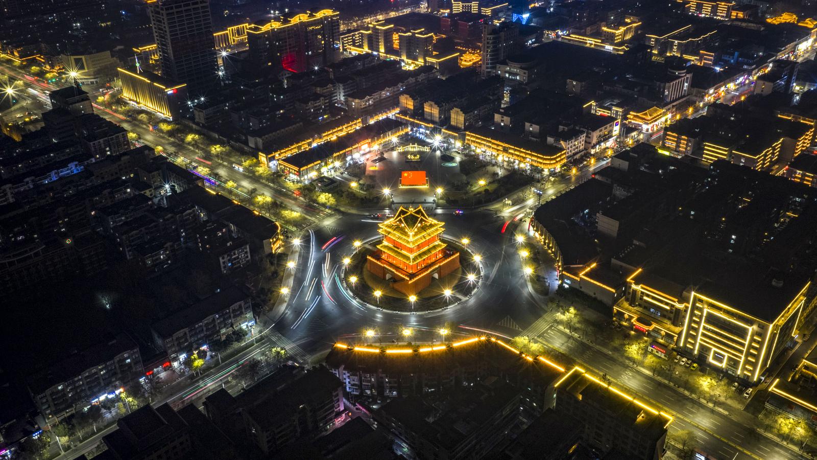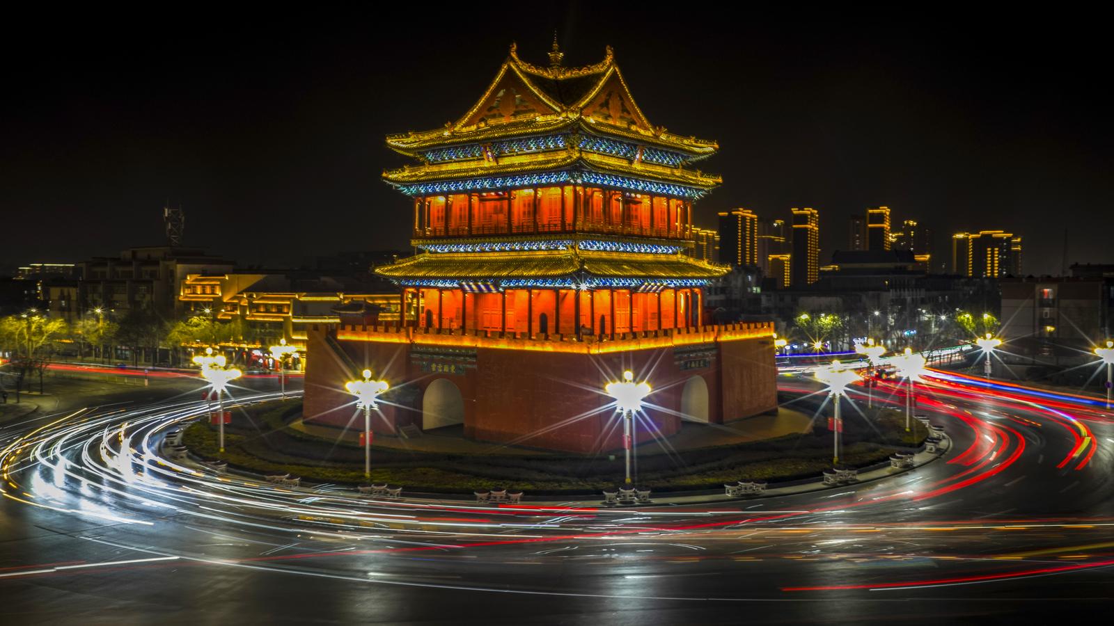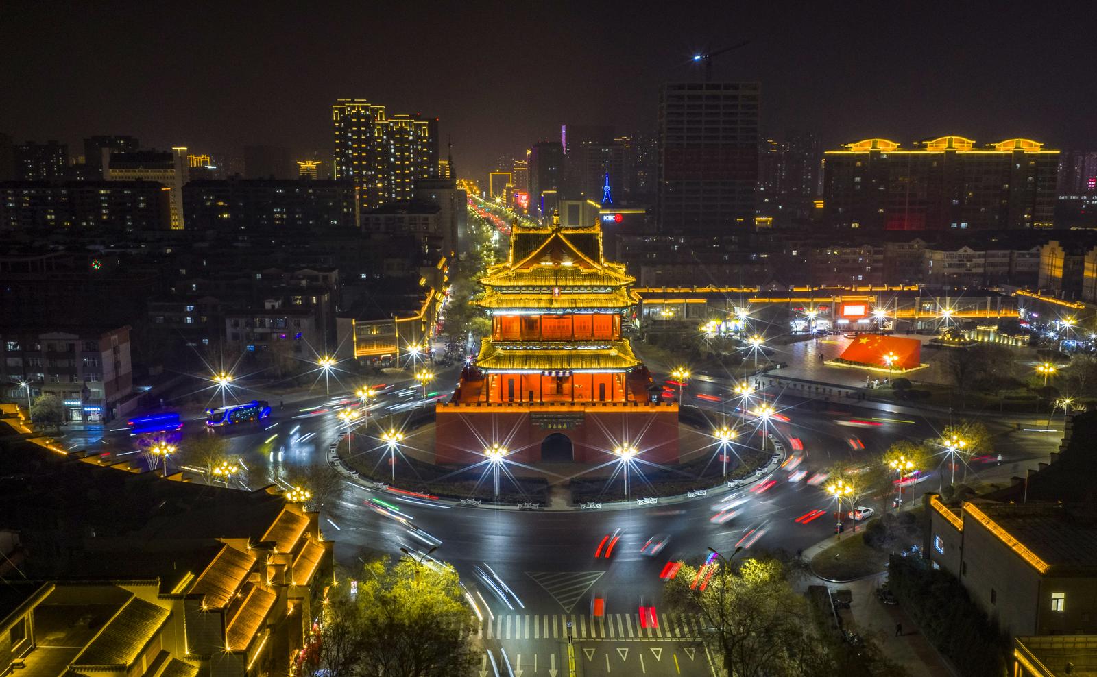 临汾:霓虹璀璨映鼓楼