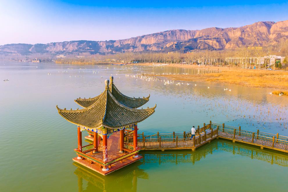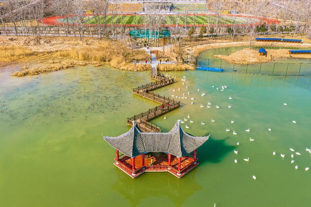 芮城圣天湖:亭台栈道旁 天鹅舞翩跹
