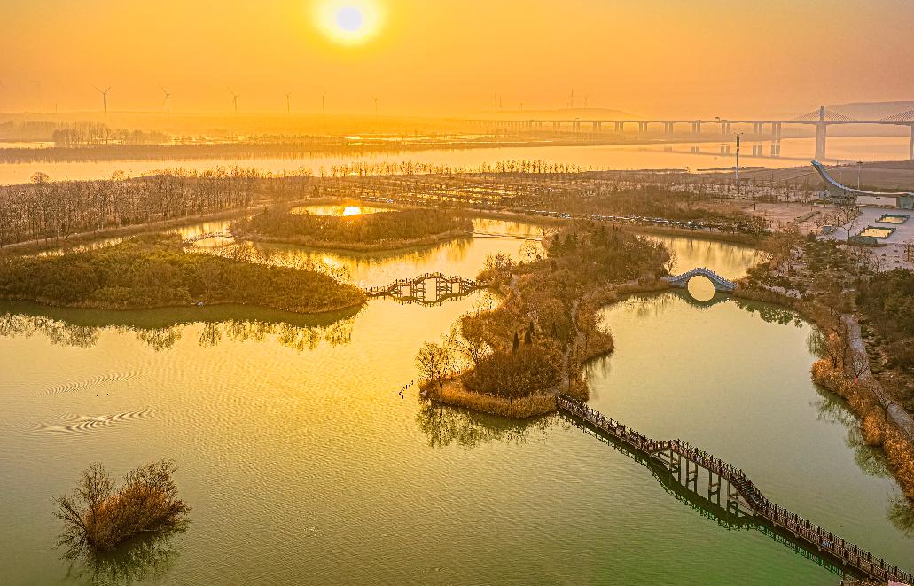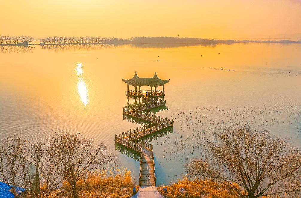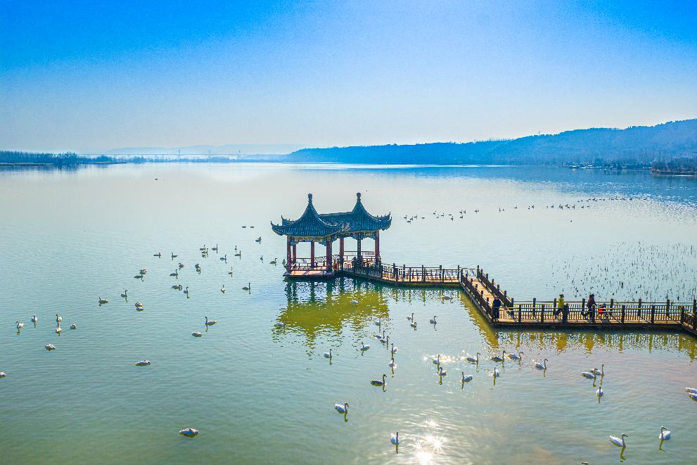 入冬以来,成群的大天鹅翩跹而至,在波光潋滟的湖面上嬉戏游弋;造型蜿蜒的木质栈道凌波而建,中式亭台伫立于水中央,游客沿着栈道缓步前行,与天鹅近距离互动,构成了一幅人与自然和谐共生的绝美画面。