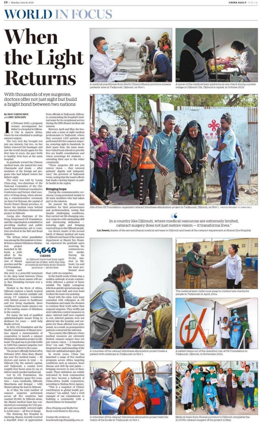 数千例眼科手术的开展,背后是山西援非医疗队的医者仁心。他们不仅为非洲患者重见光明,更在中非间架起了坚实的友谊之桥。2021年,香港共享基金会与山西省卫生健康委员会签署合作备忘录,联合启动“消除白内障致盲项目”,目标是在3至5年内在吉布提免费实施6000-7000例白内障复明手术。