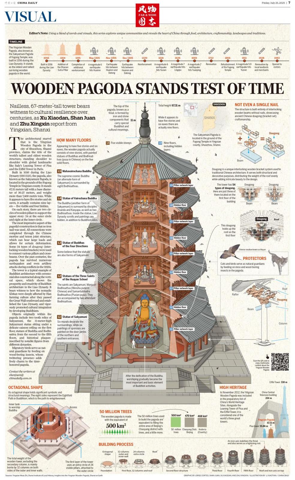 《中国日报》风物图志(Far & Wide)系列版面以信息可视化形式展现各地“风物”之美。第十六期走进山西朔州,带您感受应县木塔的千年魅力,解锁斗拱结构的精妙绝伦。