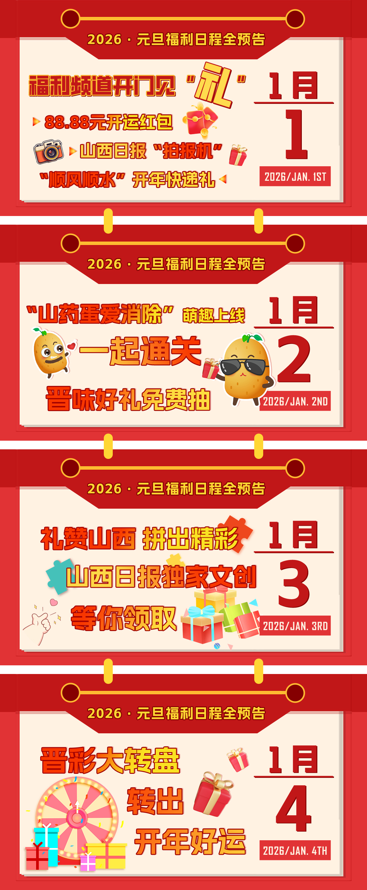 从指尖传递权威资讯到用心分享三晋烟火,山西日报客户端始终离不开每一位用户的信任与支持。值此2026开年之际,为回馈长期以来默默陪伴的新老朋友们,山西日报客户端【福利频道】2026年1月1日正式上线!更有连续三天的万元红包大派送,无套路、零门槛,把最实在的好运和感恩,打包送给每一个支持我们的你~