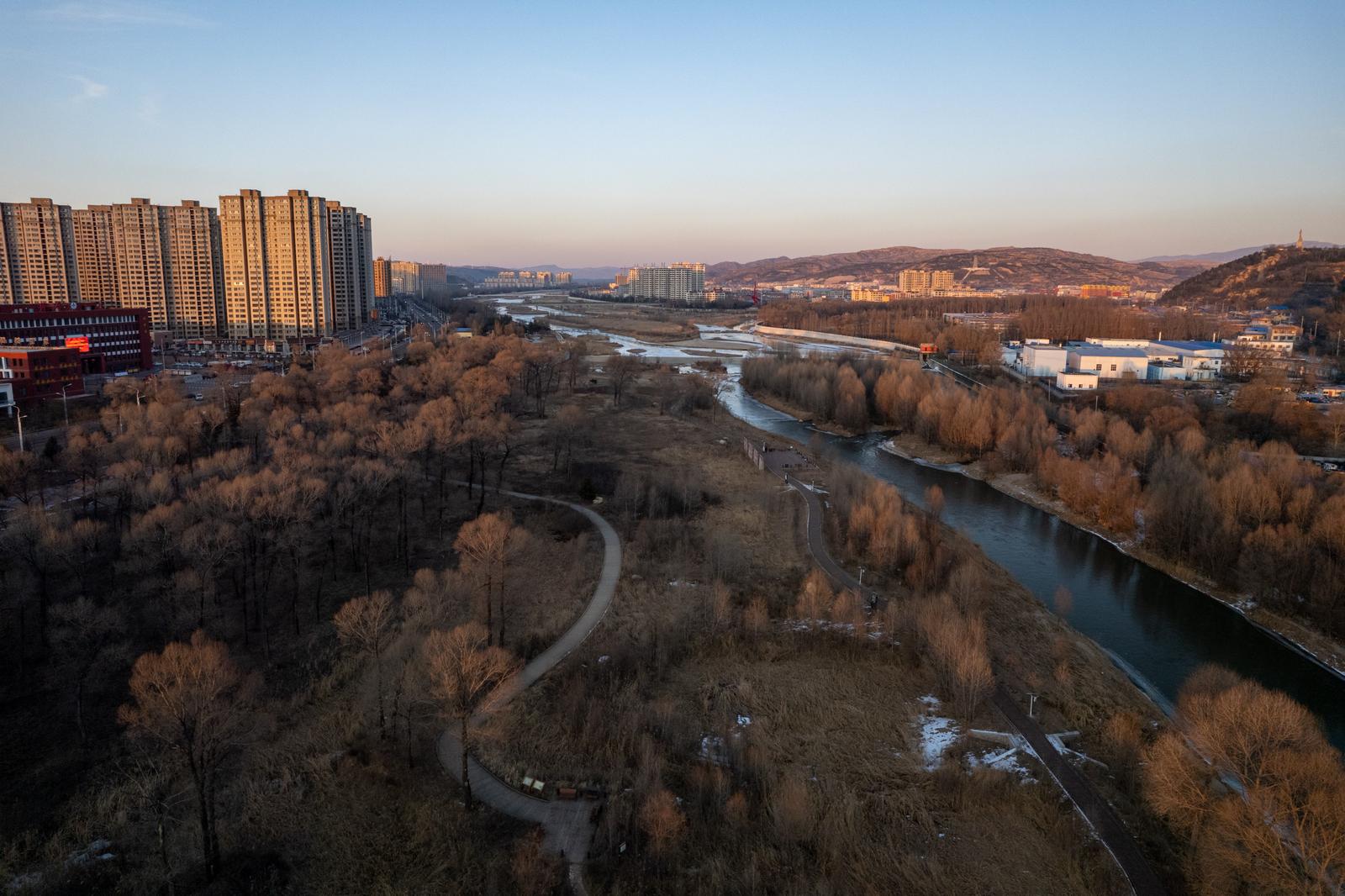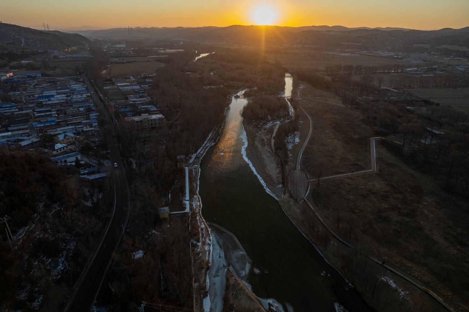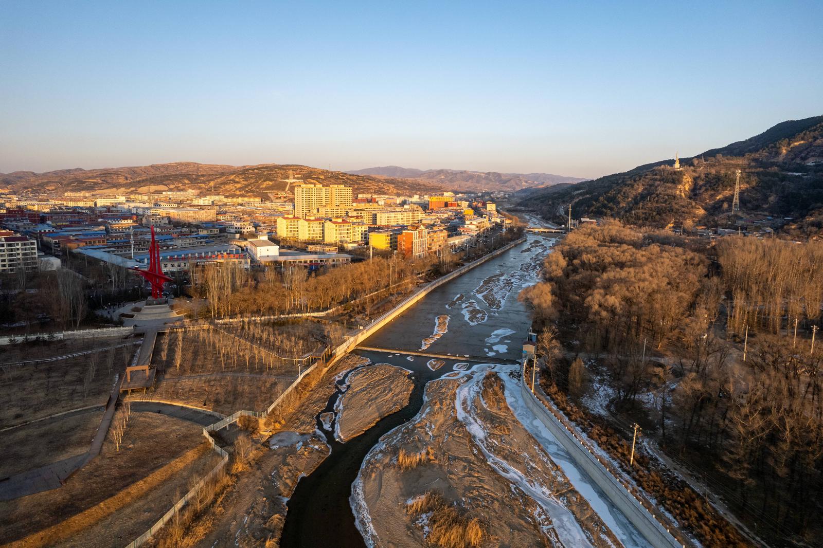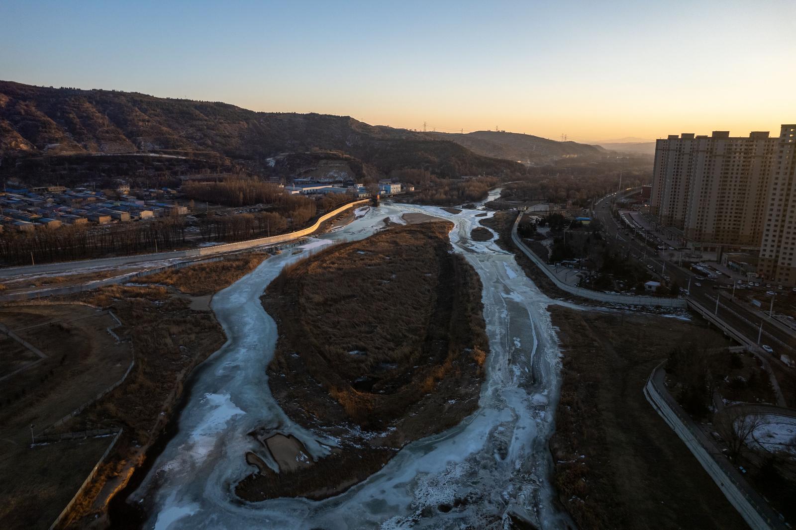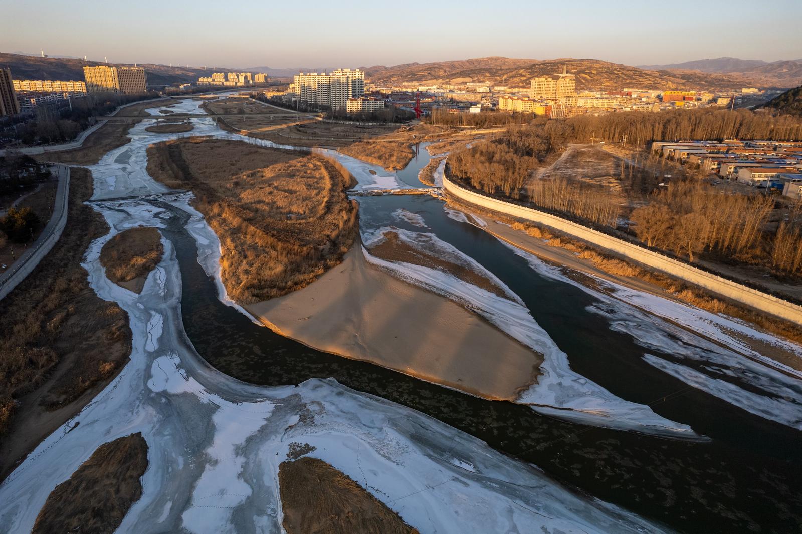 12月30日,忻州市静乐县汾河川国家湿地公园,河道冰滩交错,岸伴楼宇林丘,冬日湿地展旷美。