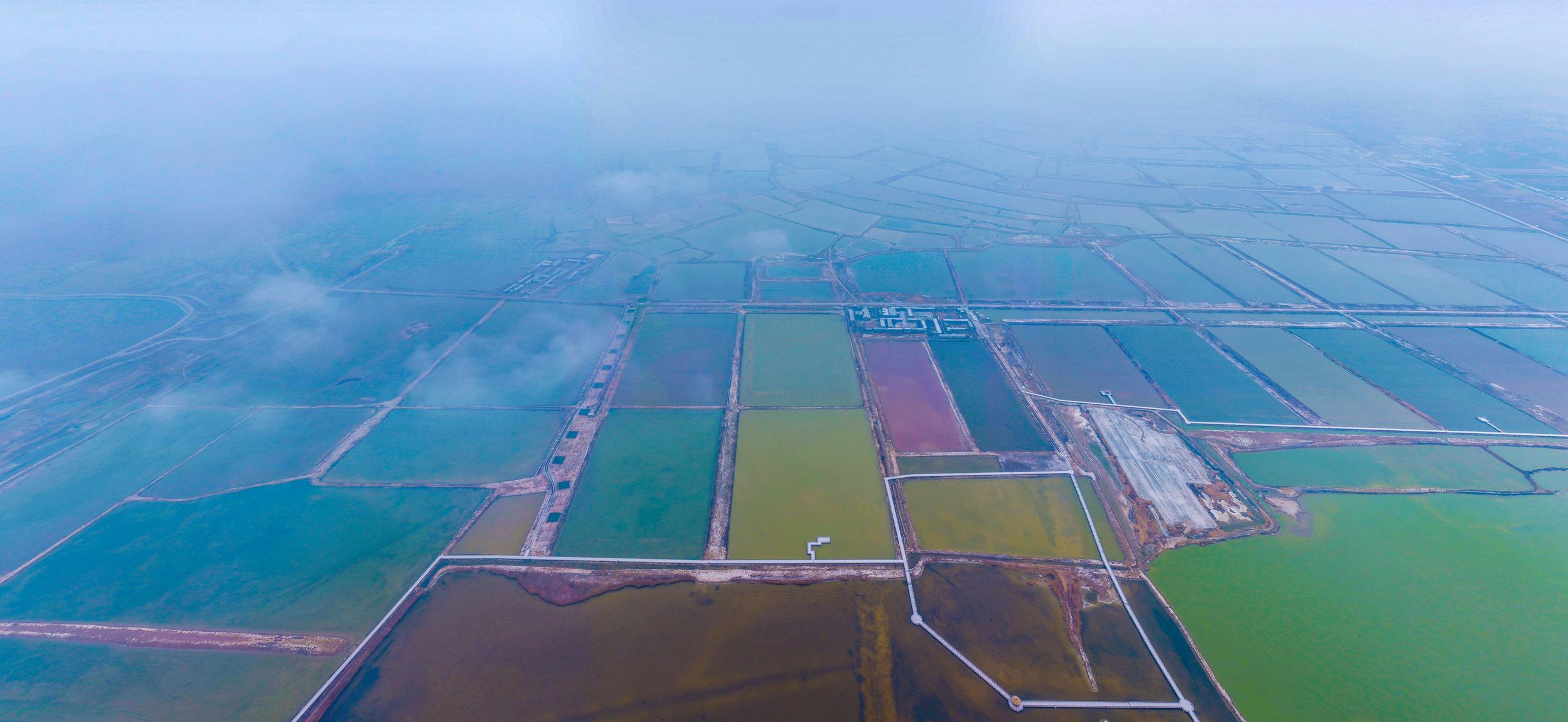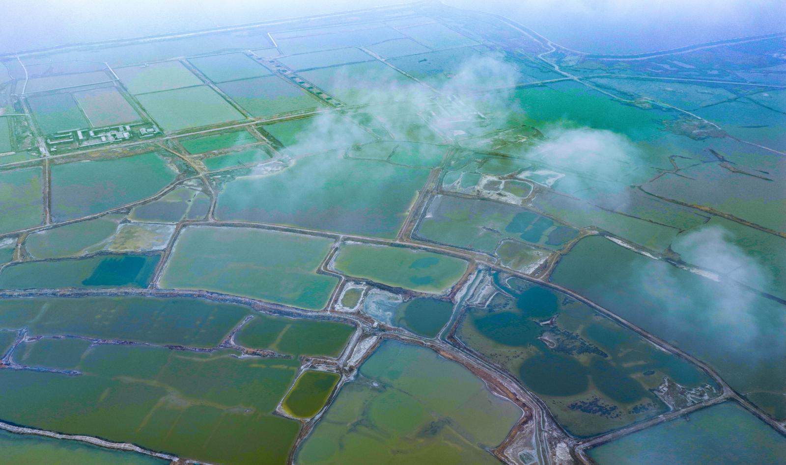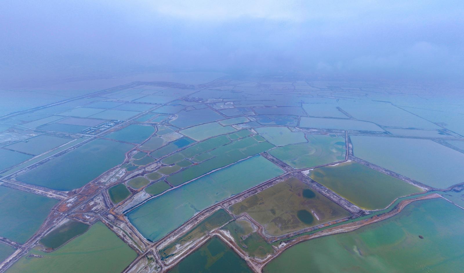 1月1日,运城市七彩盐湖在降雪后云雾缭绕。从空中俯瞰,被分割成阡陌纵横的七彩盐田在朦胧水汽中若隐若现,呈现出一种静谧而梦幻的冬日之美。