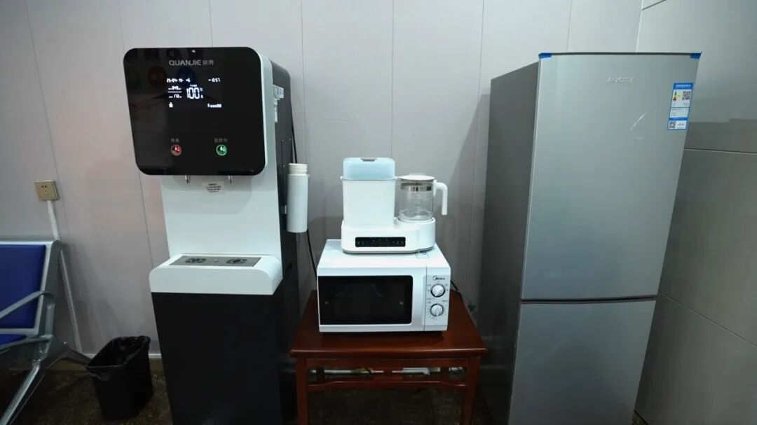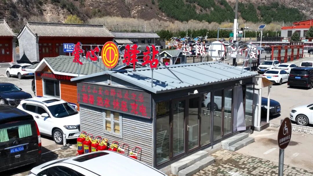 在黛螺顶公交枢纽站、游客服务中心、殊像寺等游客集中区域,“爱心驿站”标识醒目亮眼,装修风格简约而温馨。驿站内热水器、微波炉、桌椅、医药箱、多功能电源插座等基础便民设施一应俱全,更贴心增设了冰箱、储物柜、无线网络(Wi-Fi)、报刊书籍、雨伞等服务设施。无论是想喝口热水、加热饭菜,还是给手机充电、短暂休息,驿站都能满足需求。