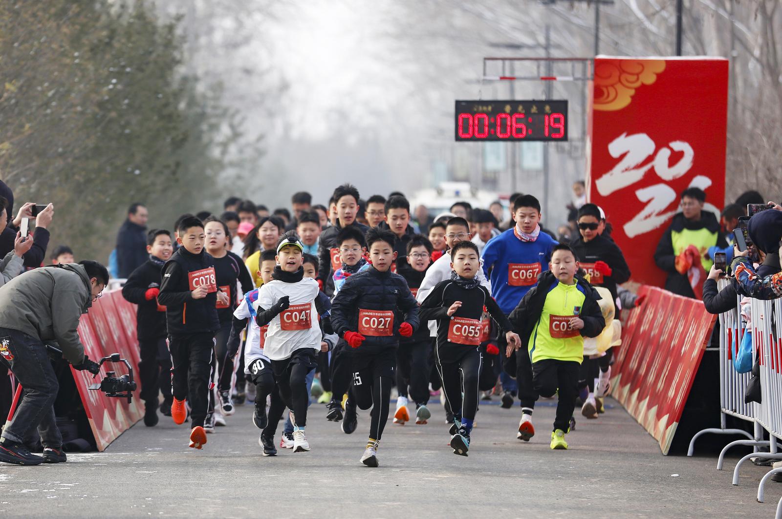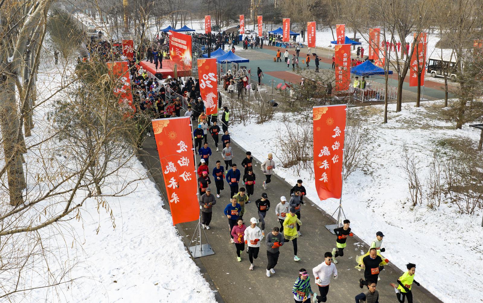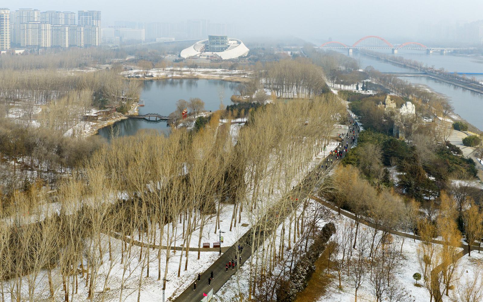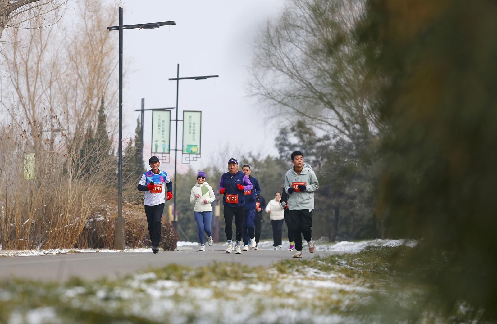 1月3日,健身爱好者在临汾市汾河文化生态景区健身步道内参加迎新年健康跑活动。
