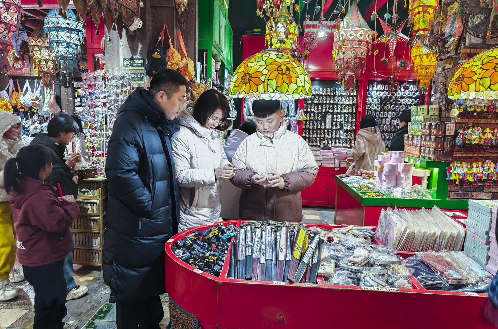 1月2日晚,平遥古城南大街灯火通明,游客络绎不绝。元旦假期,平遥古城“夜经济”再度火爆,游客们漫步古街,观赏夜色古韵,品尝特色美食,购买文创手工艺品,着古装打卡留念,展示出集夜游、夜娱、夜食、夜购、夜赏为一体的多元化旅游“夜经济”发展新图景。