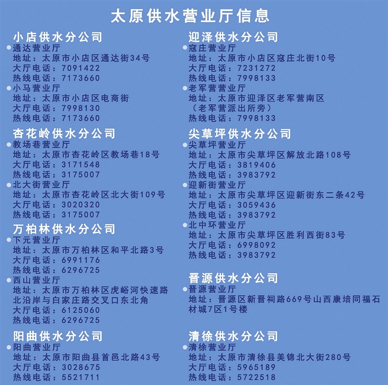 今后,各城区居民遇到供水问题,除了可以继续拨打太原供水集团24小时服务热线3094444外,也可以就近联系所在城区分公司,第一时间获取帮助。