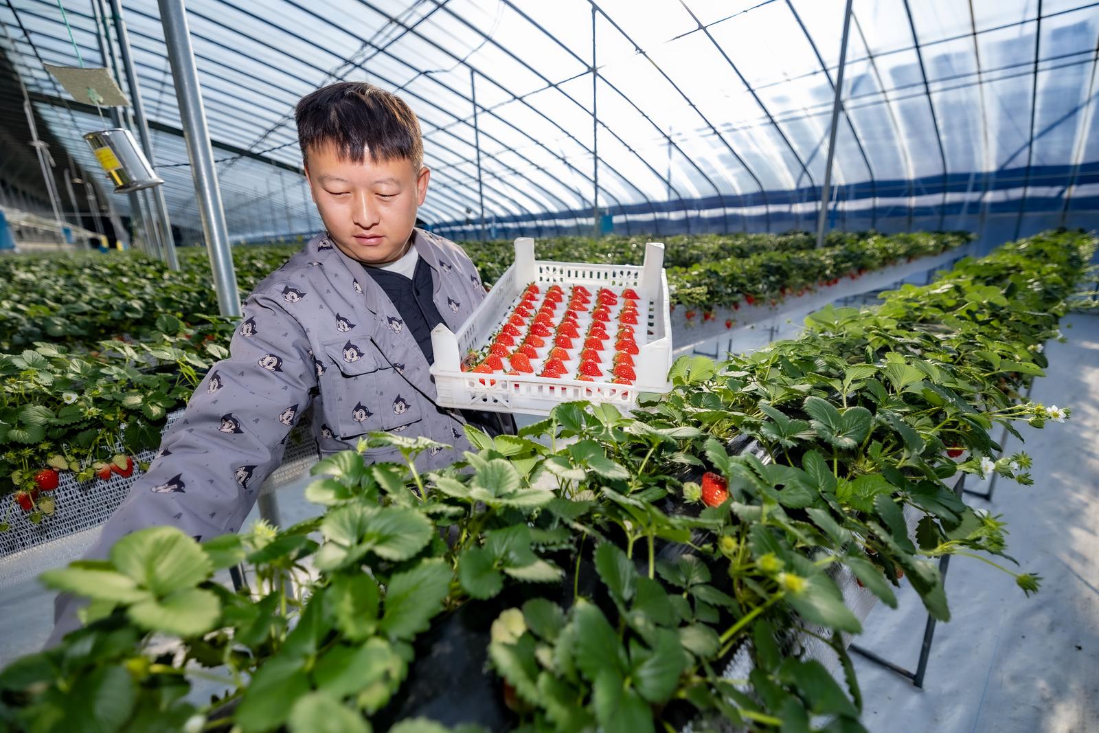 1月5日,运城市平陆县张店镇高效农业产业基地内,“空中草莓”进入成熟采摘期。棚架上层层垂挂的栽培带里,鲜红饱满的草莓坠满藤蔓。农户穿梭其间加紧采摘、分拣,新鲜果品即将批量上市。