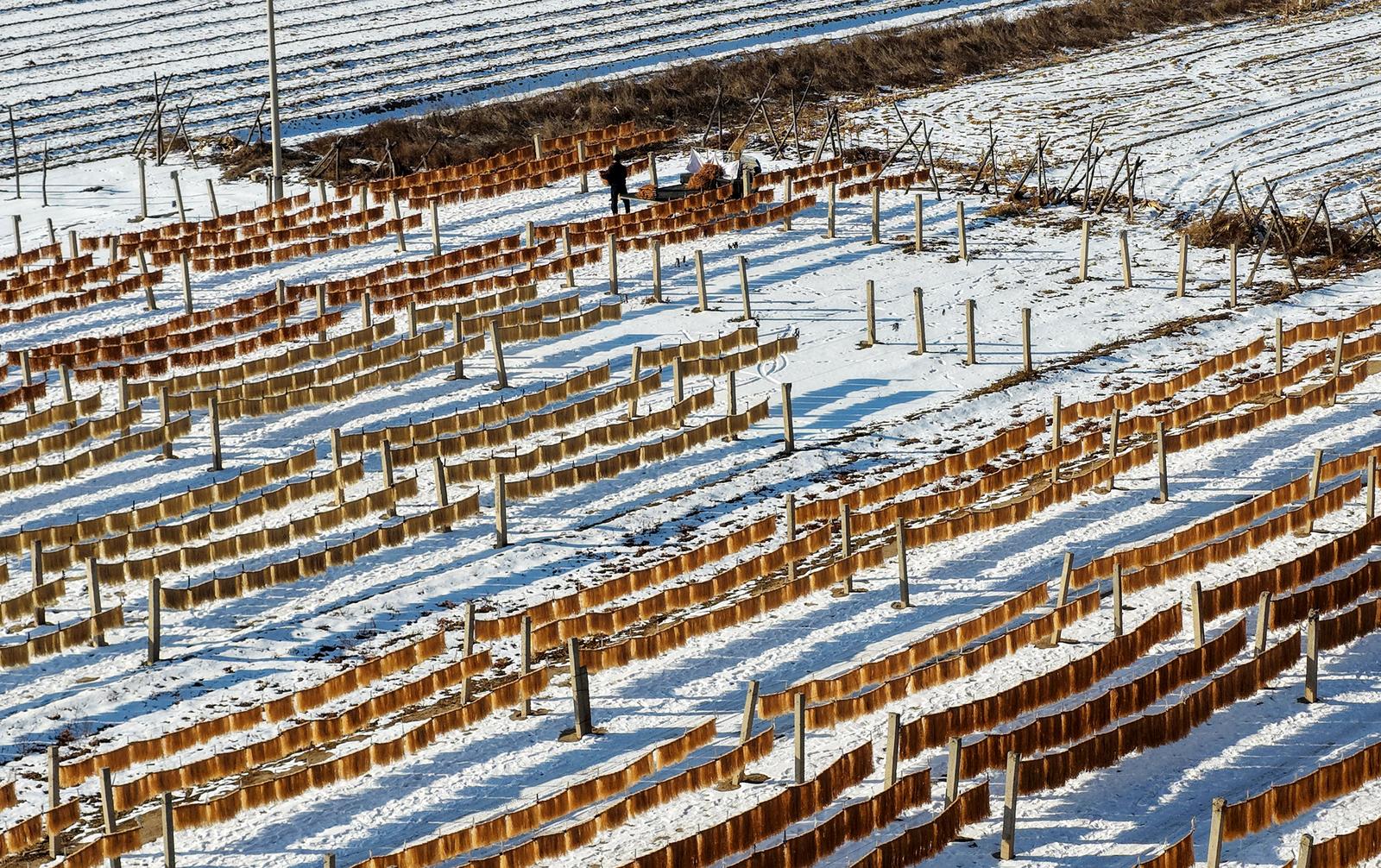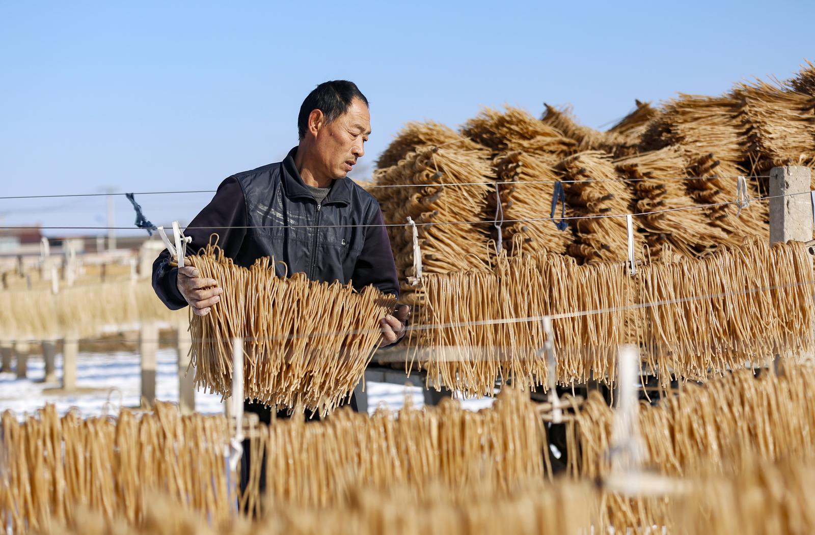 在村内的晾晒场上,一排排粉条整齐悬挂于晾架之上,于冬日暖阳的映照下晶莹剔透,与周边的田园乡村景致相互映衬,构成一道独具特色的乡村风景线。