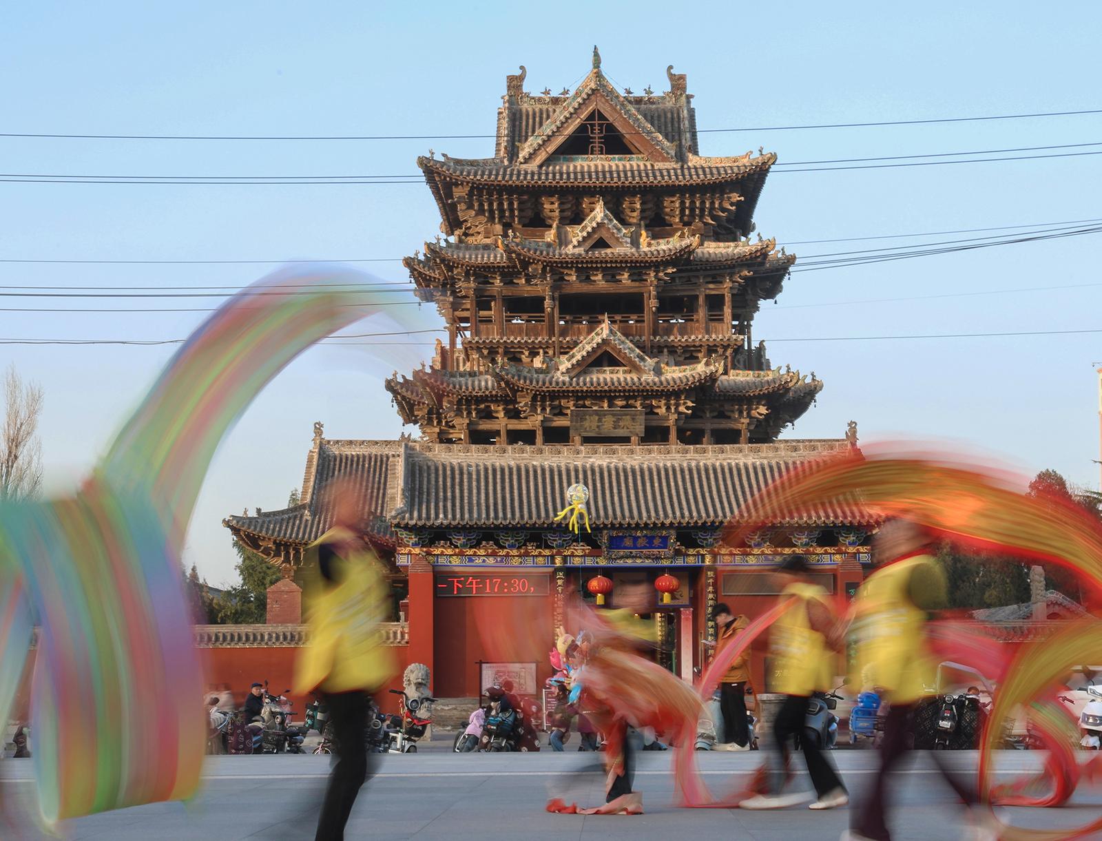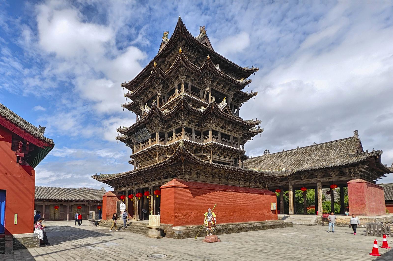 被誉为“中华第一木楼”的飞云楼,位居全国重点文物保护单位万荣东岳庙,是始建于唐代的著名纯木质结构建筑。该楼高23.19米,通体无一根铁钉,全靠榫卯结构精密衔接,外观三层,内有五层,345组斗拱如云簇拥,32个翘角悬挂的铜铃尽显“飞檐翘角,凌云欲飞”的建筑美学。