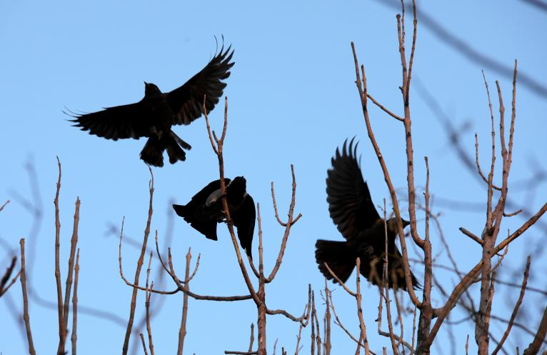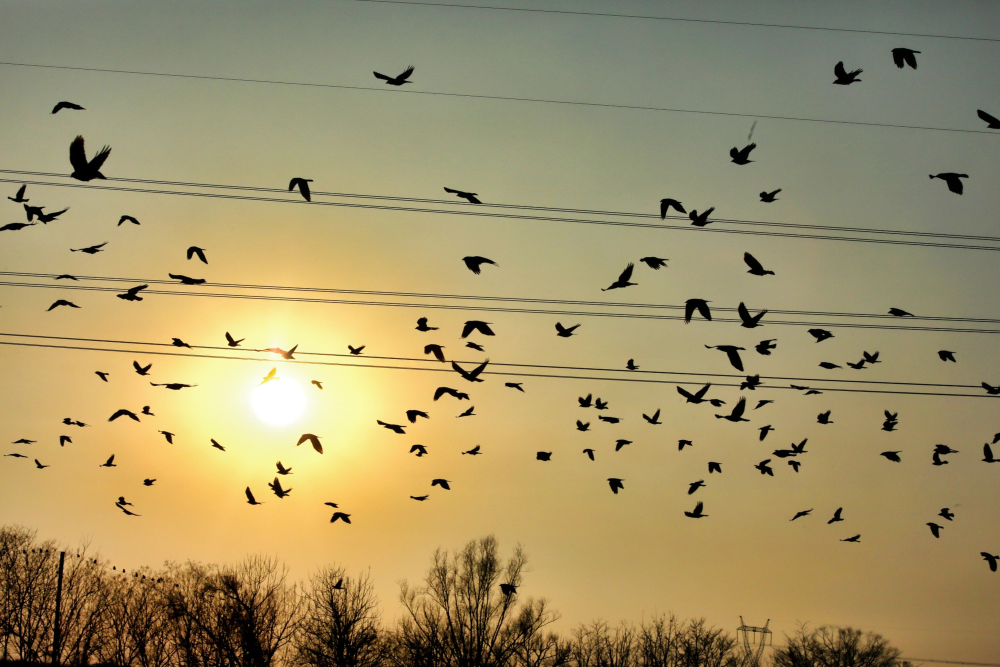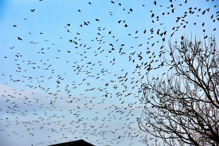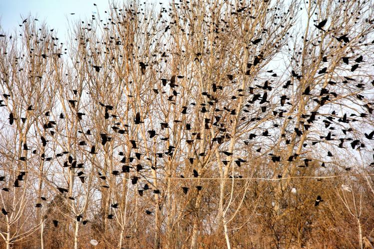太谷:暮色林间群鸟翔空