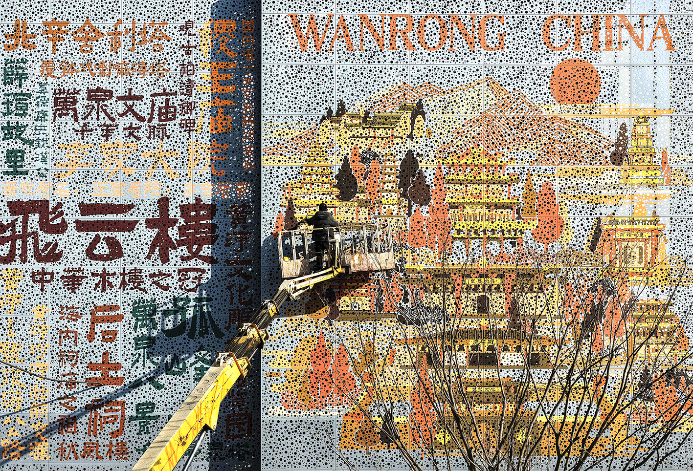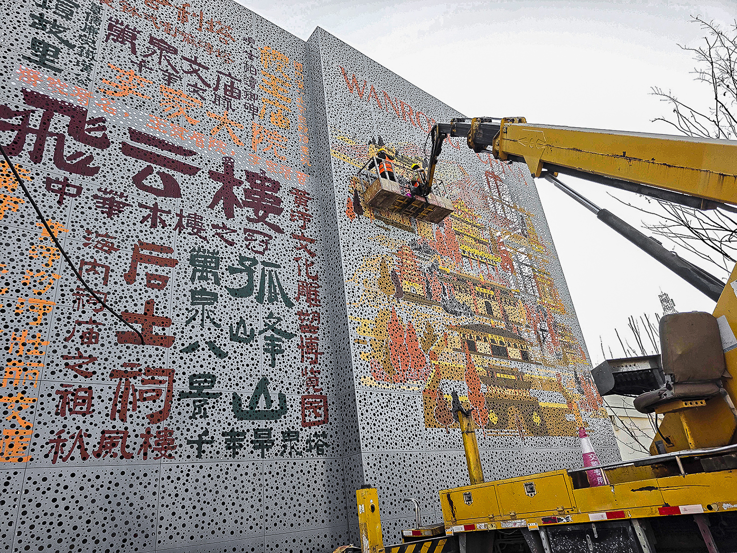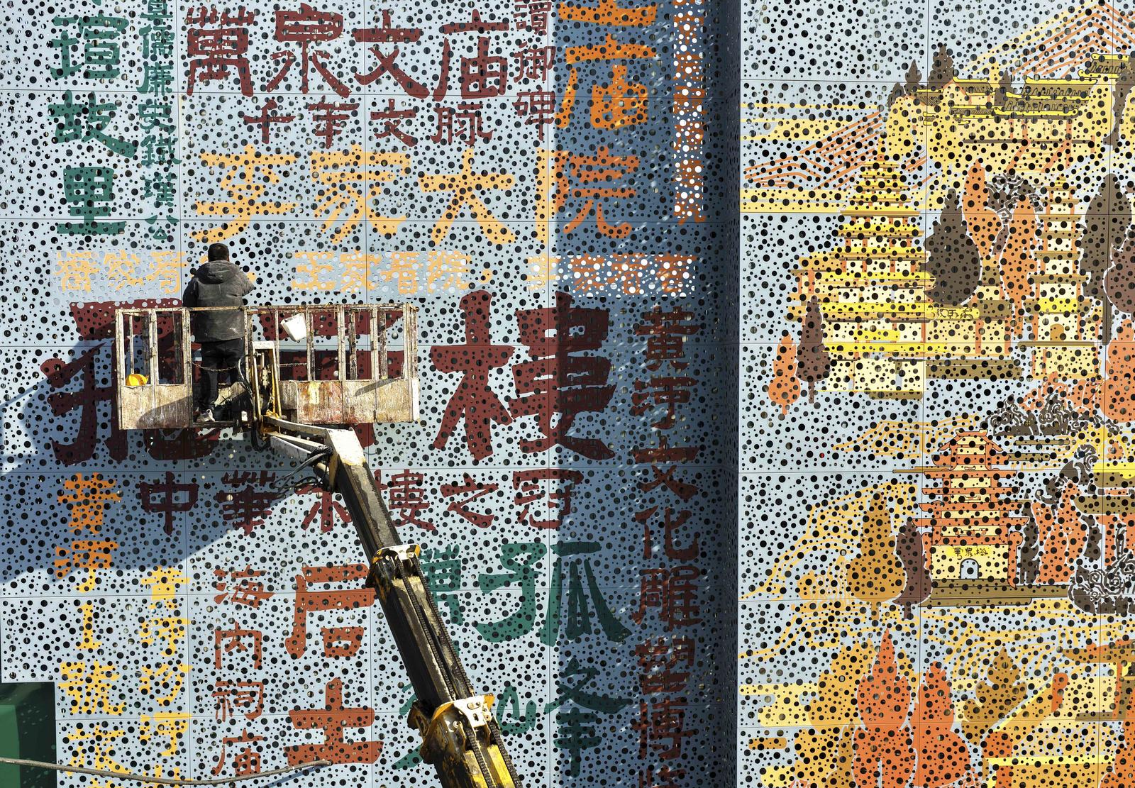 1月13日,在运城市万荣县飞云楼前的后土文化广场东侧,一面宣传当地旅游景点的特色文化墙正在有序施工。