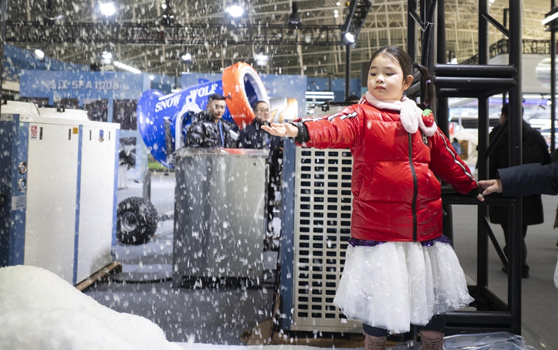 2026年1月6日,在2026哈尔滨国际冰雪经济博览会冰雪装备展区,小朋友触摸制雪机现场制造的雪花。新华社发(张春雷摄)