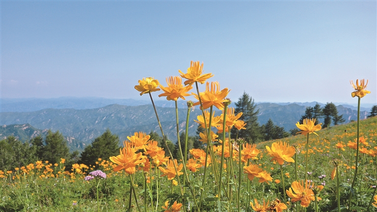 五台山的生态魅力,始于其独特的“垂直生命带”。从山脚的农垦带向上,山地落叶阔叶灌丛、针叶阔叶混交林、寒温性针叶林、亚高山灌丛依次铺展,最终在山顶形成亚高山草甸,构成“一山存四季,十里不同天”的生态奇观。作为华北地区典型的山地草甸,盛夏时节金莲花、苔草等几十种植物肆意绽放,宛如金色星河落满翠绿地毯。