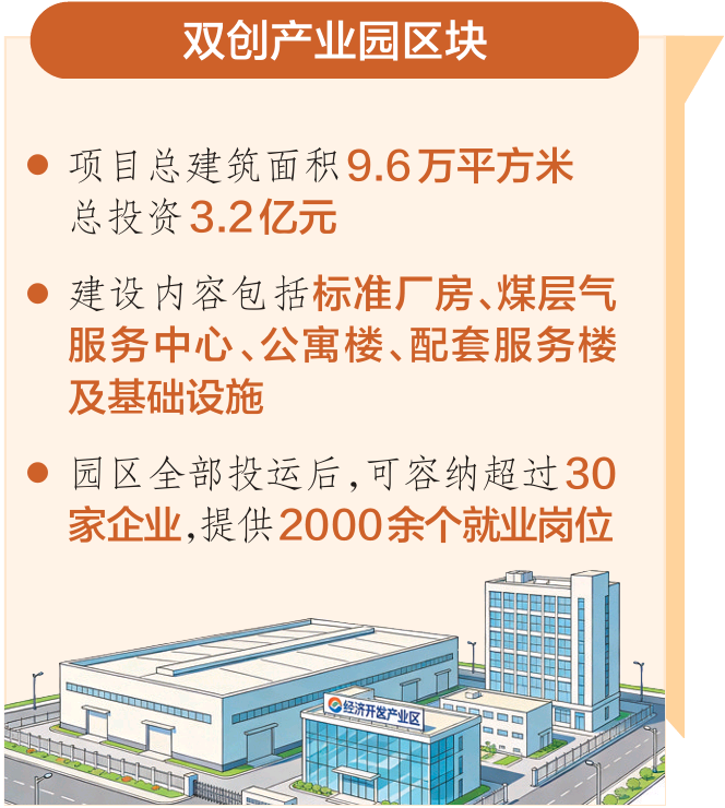 该项目总建筑面积9.6万平方米,总投资3.2亿元,建设内容包括标准厂房、煤层气服务中心、公寓楼、配套服务楼及基础设施。2025年11月,双创产业园区块项目完成竣工备案,较原定计划提前5个月交付。园区建设的高效推进为产业项目落地抢占了宝贵先机。