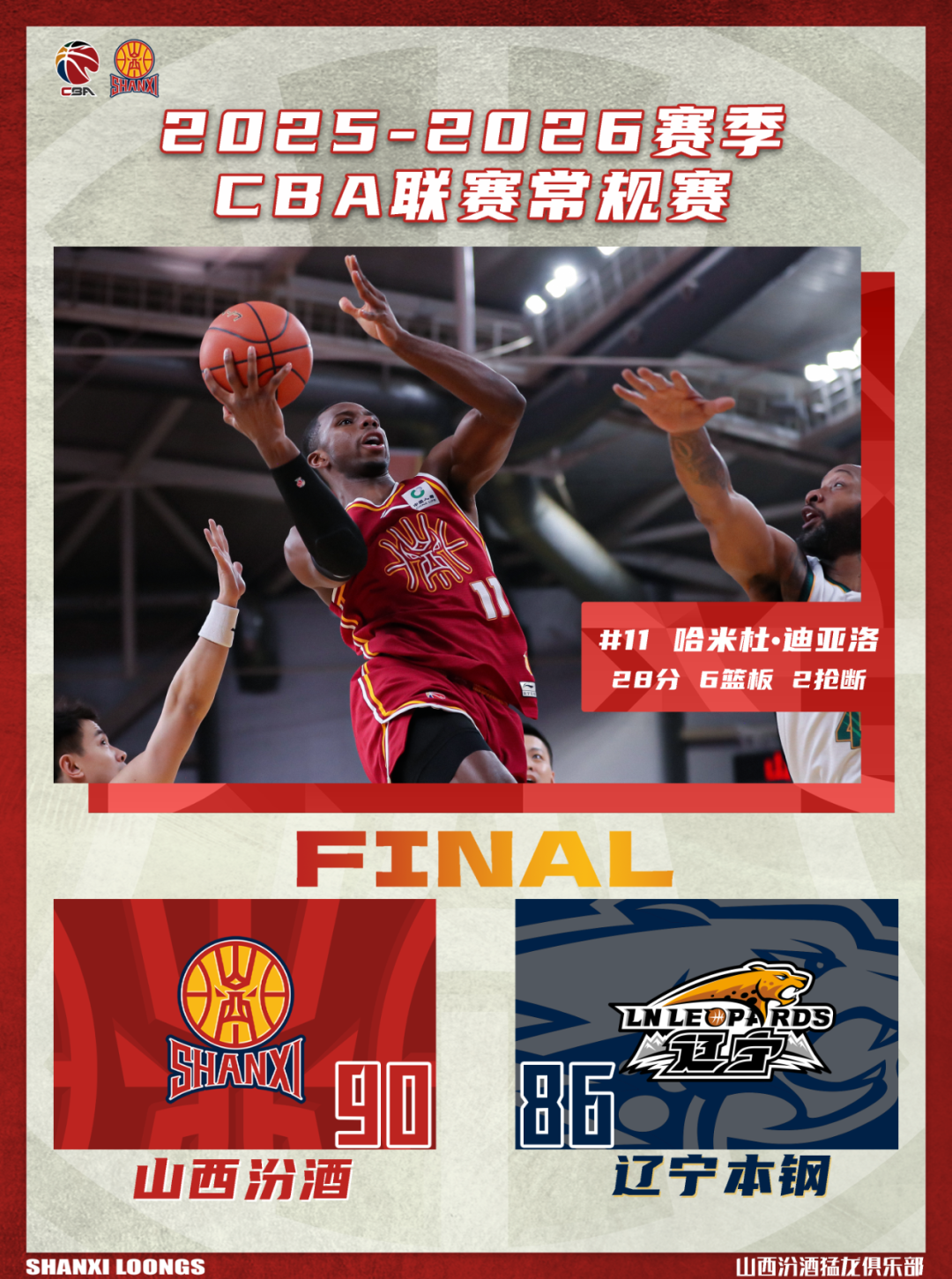 1月20日晚,2025-2026赛季中国男子篮球职业联赛(CBA)常规赛第17轮上演一场焦点对决,山西汾酒男篮坐镇主场以90比86力克辽宁本钢男篮,收获三连胜。球队在接连战胜北京北汽与福建晋江文旅队后,延续了出色的竞技状态。