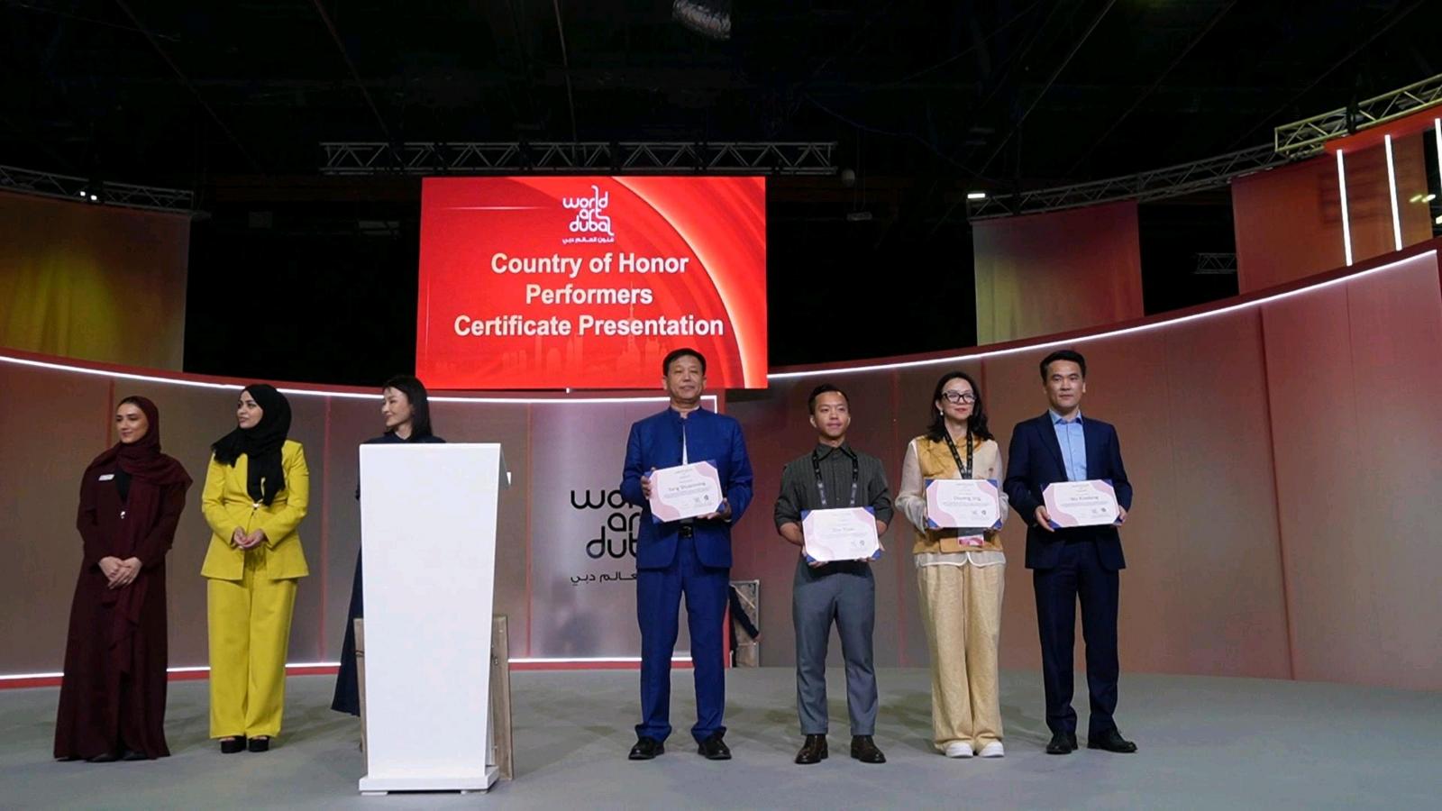 “迪拜世界艺术博览会”组委会向优秀展品作者颁发荣誉证书。
