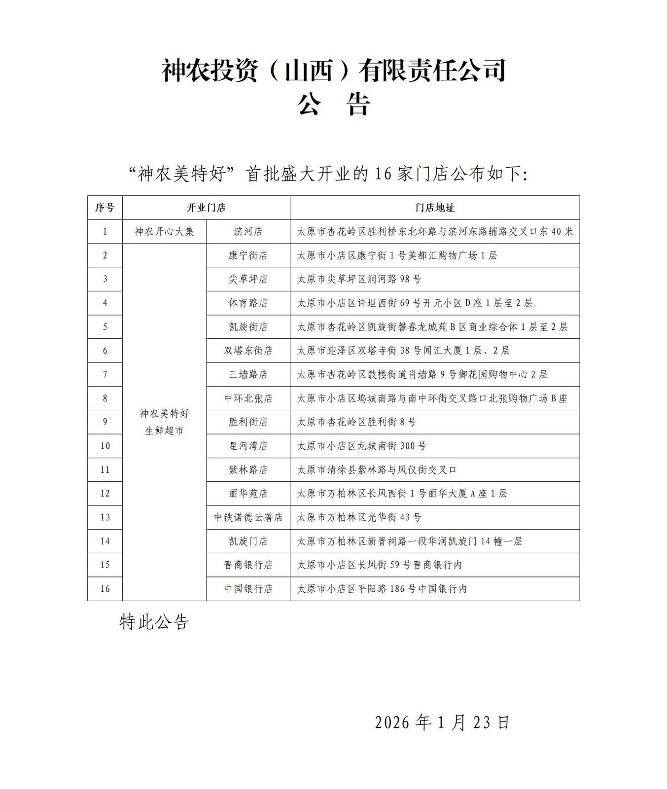 神农美特好首批16家开业门店相关信息