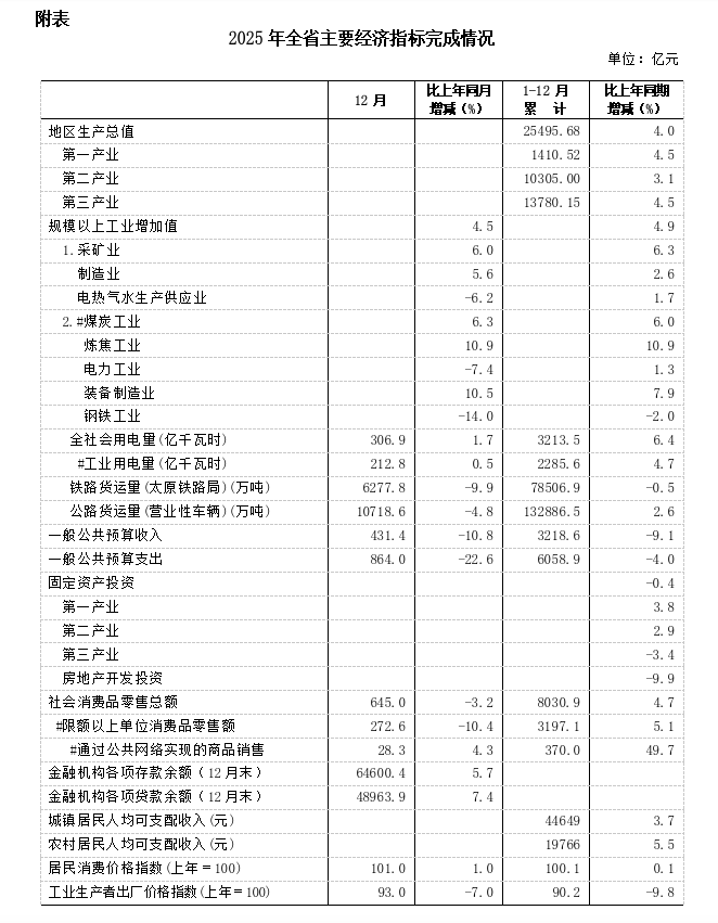 2025年,全省上下坚持以习近平新时代中国特色社会主义思想为指导,认真贯彻落实党中央、国务院决策部署及省委、省政府各项工作要求,攻坚克难、砥砺前行,坚定不移推动高质量发展、深化全方位转型,新质生产力稳步发展,内需潜力有效释放,民生福祉不断增进,全省经济保持总体平稳、稳中有进态势。