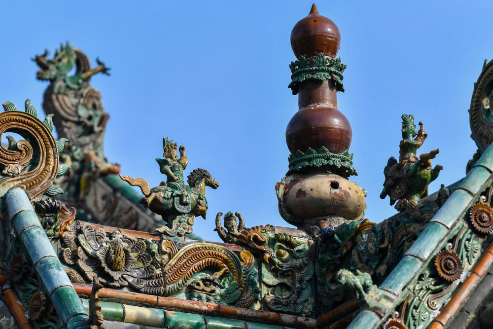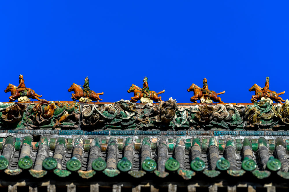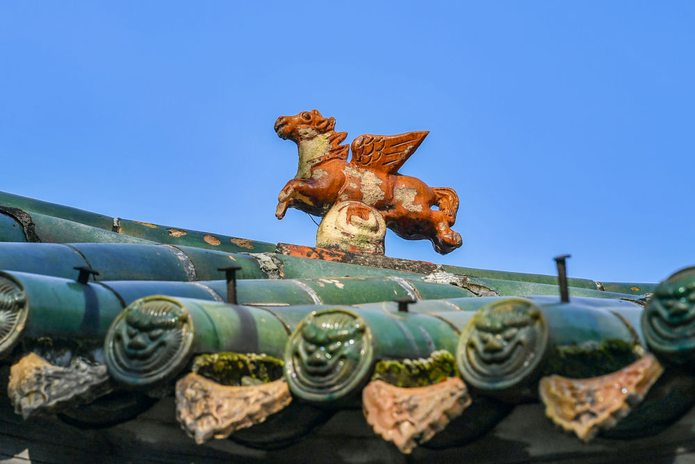 这是在山西省运城市关帝庙拍摄的古建顶上的飞马造型装饰构件。