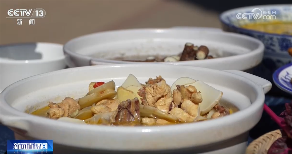 除了长知识,来到百草村,地道美食可不容错过,这个是黄精炖鸡,这是当归羊肉,咱们也来尝一口。没有羊肉的膻味,只有醇厚的香甜。亲手制作专属纪念品也成为亲子互动、学生研学的热门环节,大家可以制作自己的专属香囊,设计创作像素版草药花等装饰周边,模样别致,不管是自留还是送人都很有纪念价值。