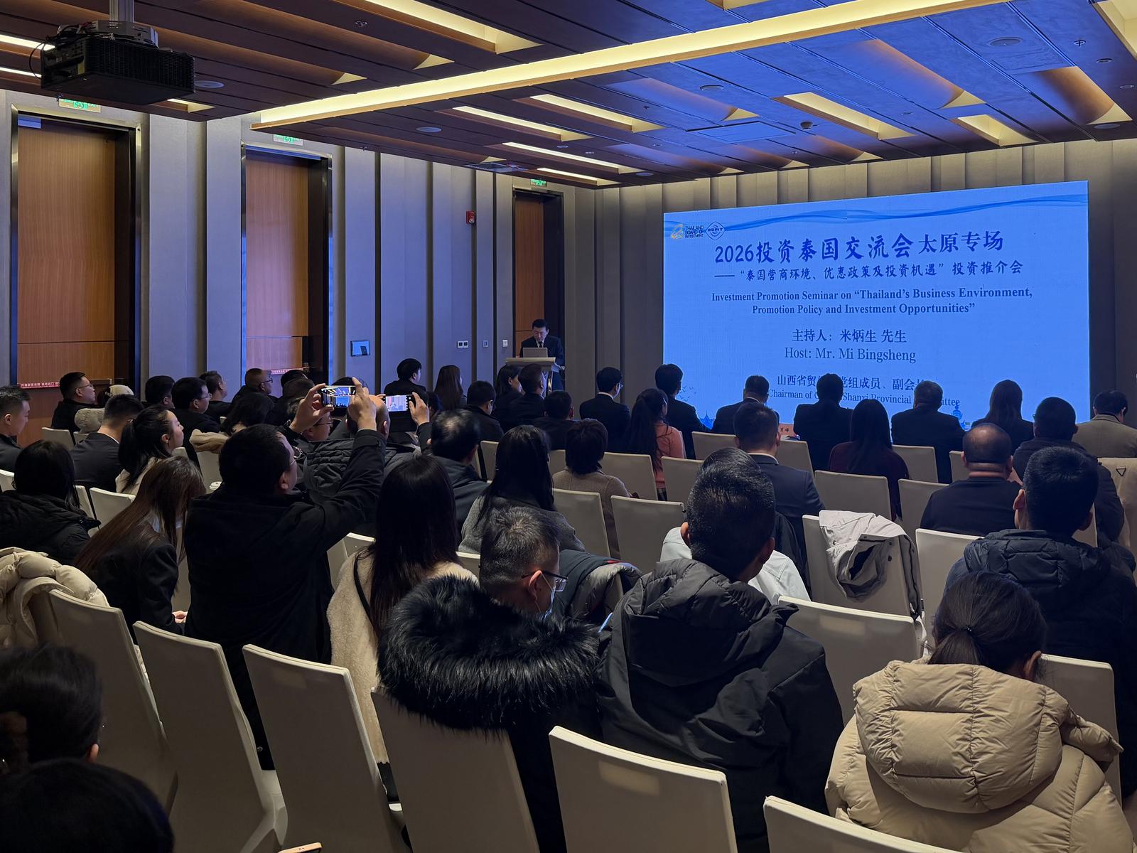 为抢抓中泰建交50周年合作新机遇,精准对接山西优势产业“走出去”需求,1月26日,省贸促会与泰国投资促进委员会北京办事处、中国贸促会商法中心在并共同举办2026投资泰国交流(太原专场)活动。本次活动搭建起政企对接、信息共享的桥梁,邀请中泰两国投资领域、金融行业、产业园区及法律界的权威专家,全方位解读泰国投资新政策、新机遇、新路径。