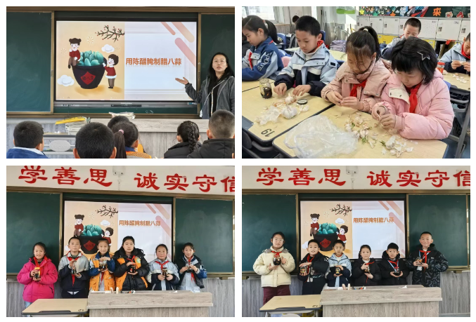 南坪头小学以腊八节为契机,在劳动课上开展了“巧手制蒜香 浓情迎腊八”主题实践活动。老师详细示范了腊八蒜的制作流程,并强调了关键操作要点,同学们分工协作兴致勃勃地投入到制作中。大家不时交流心得,遇到剥蒜困难、装瓶不均等问题时,互相帮忙、共同解决,课堂上洋溢着欢乐的劳动氛围。