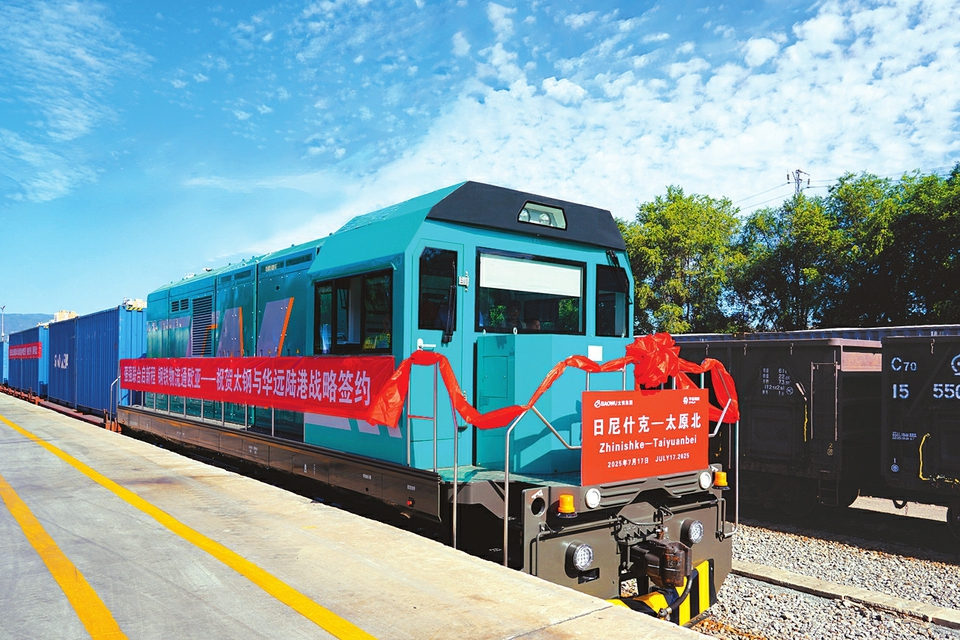 2025年7月17日,一列中欧(亚)班列驶入太钢集团采购中心仓储作业区站台线。