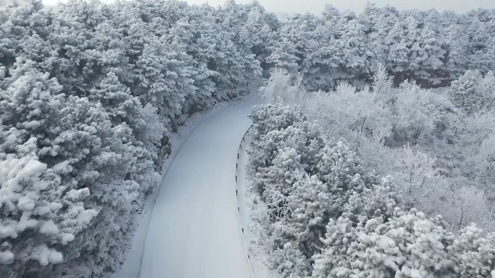 从空中俯瞰,雪后的太行山银装素裹、群峰纵横、云雾升腾,蜿蜒的山路如一条巨龙在山间盘绕,共同构成了一幅流动的水墨长卷;而漫山遍野的苍松翠柏被雪凇覆盖,如棉絮轻覆,似玉蕊垂枝,好像进入童话般的冰雪世界。