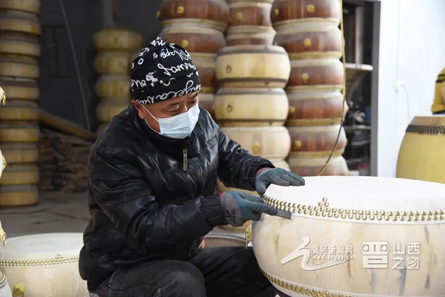 图为匠人正在为威风锣鼓钉皮紧固。赵润洋 摄