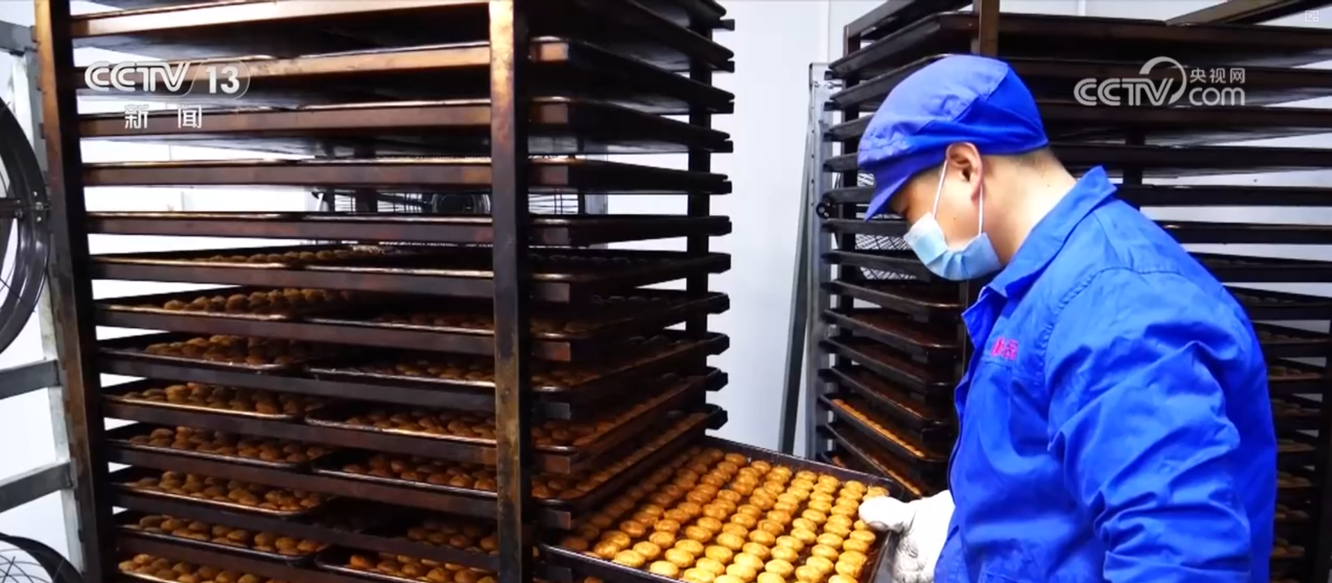 在安徽休宁县,这家食品加工企业的生产车间里,一个个黄山烧饼在流水线上不停传输,然后装盘放入智能化的热风旋转炉内烘烤。不一会儿,烧饼变得金黄,诱人的香气弥漫在整个车间。