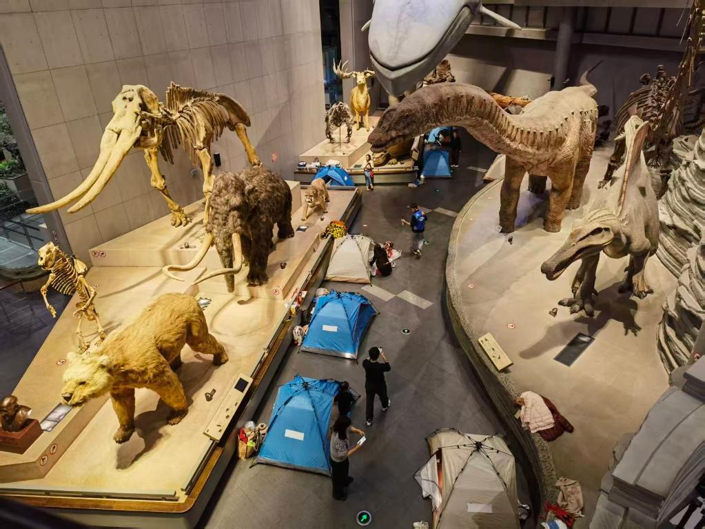 1月31日晚,约90组亲子家庭在上海自然博物馆内化身“动物王国探险家”,聆听科普讲座,观看《羽龙传奇》科普电影、“生命长河”沉浸式戏剧和《非洲秀》,再前往馆内不同展区观察动物化石的特征……完成一系列“探险”任务后,游客通过抽签的方式前往馆内预设点位扎起露营小帐篷,开启自然博物馆内的亲子夜宿。