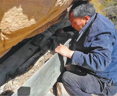 和郭海波一起攀爬了半个多小时,越过一处山间溪流,记者注意到右前方出现了一面红褐色的峭壁。郭海波指着峭壁中间凹进去的一处平台说:“就在那儿了。很多战士的遗骸都在这种石缝中间,当时村民们用门板把牺牲的战士掩放在那里,只是勉强遮蔽一下。”平台上,堆放着已经有些朽坏的木板。郭海波小心地拨开絮状的衣物残片,把里面的骨头一块块捡起来,放进袋子。