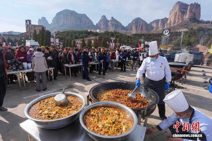 除了非遗展区,在场地一侧安排的“千人百桌宴”也提前烘托出浓浓年味。偌大的场地内,10人一桌的圆桌分4列排开,近千人同时用餐,“大烩菜、开花馍,厨师现场制作的饭菜热气腾腾,胃口一下就打开了”。