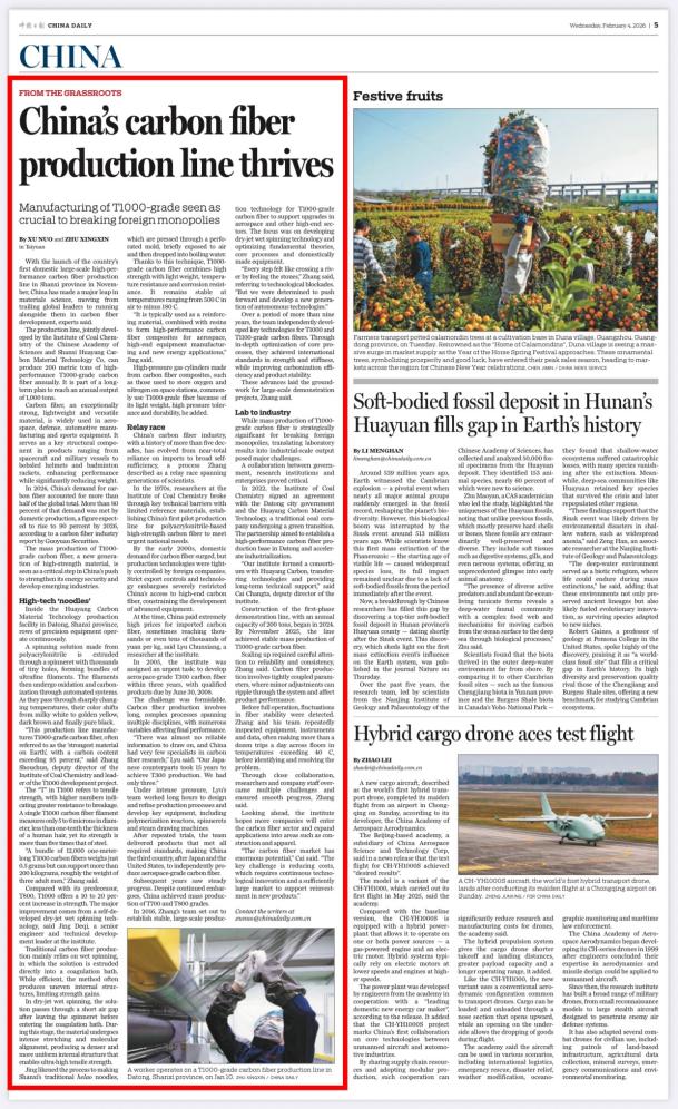 张寿春说:“一束由12000根1米长的T1000级碳纤维组成的丝束,重量仅0.5克,却能承受200多公斤的载荷,大约相当于三位成年男性的体重。”