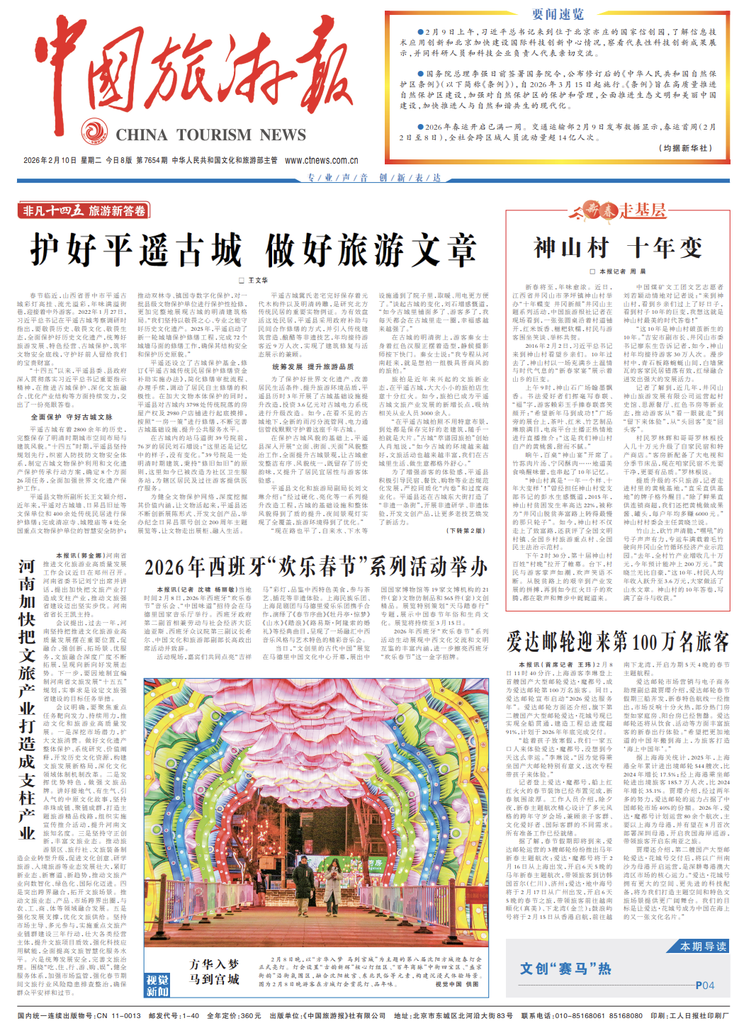 春节临近,山西省晋中市平遥古城彩灯高挂、流光溢彩,年味满溢街巷,迎接着中外游客。2022年1月27日,习近平总书记在平遥古城考察调研时指出,要敬畏历史、敬畏文化、敬畏生态,全面保护好历史文化遗产,统筹好旅游发展、特色经营、古城保护,筑牢文物安全底线,守护好前人留给我们的宝贵财富。