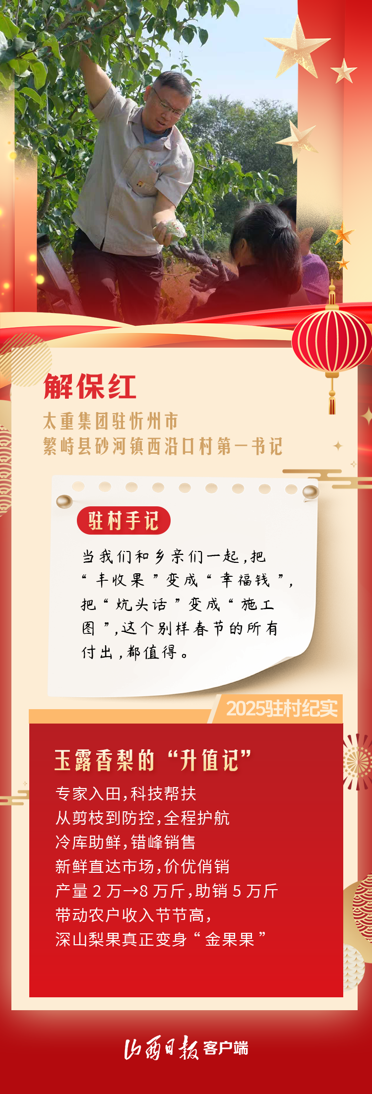 解保红在驻村日记中这样写道:“当我们和乡亲们一起,把‘丰收果’变成‘幸福钱’,把‘炕头话’变成‘施工图’,这个别样春节的所有付出,都值得。”