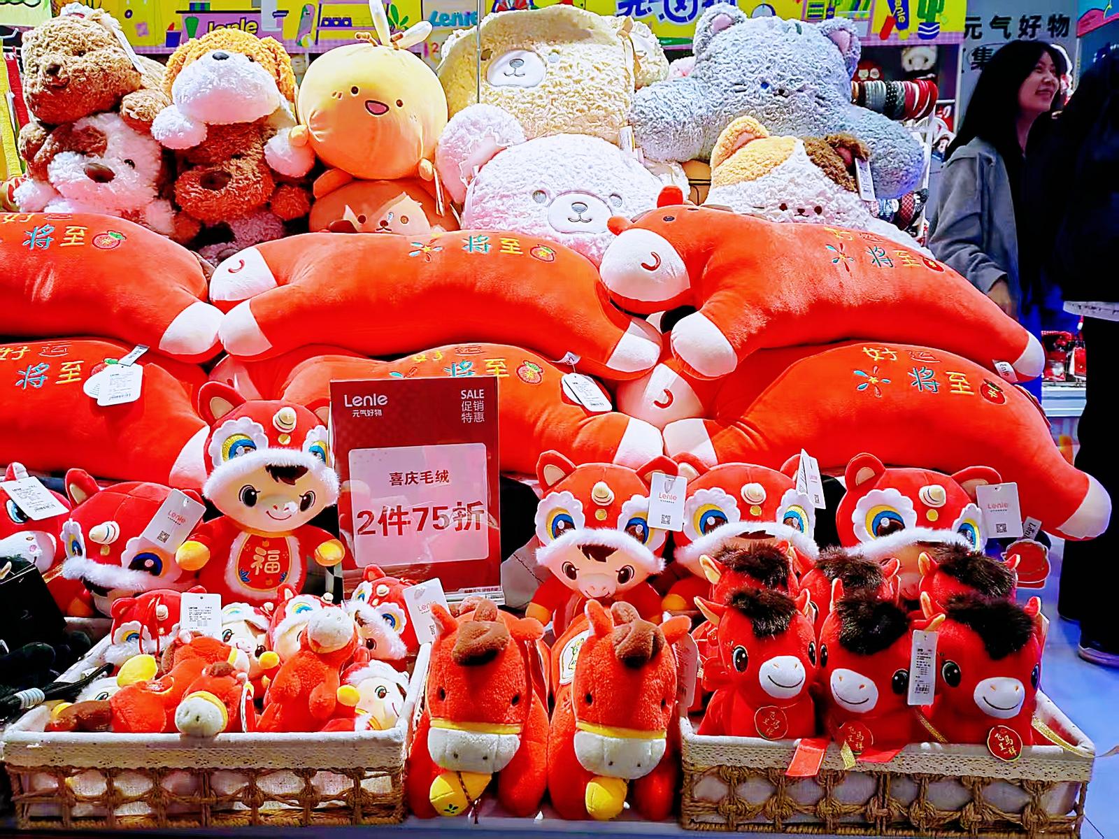 毛绒玩具摊位前,马年主题玩偶格外抢手。憨态可掬的红马公仔整齐排列,印着 “马到成功”“福马迎春” 的字样,契合着丙午马年的吉祥寓意,也藏着人们对新一年的美好期许。小朋友将自己精心挑选的毛绒小马打包装袋,把这份专属马年的喜庆带回家。